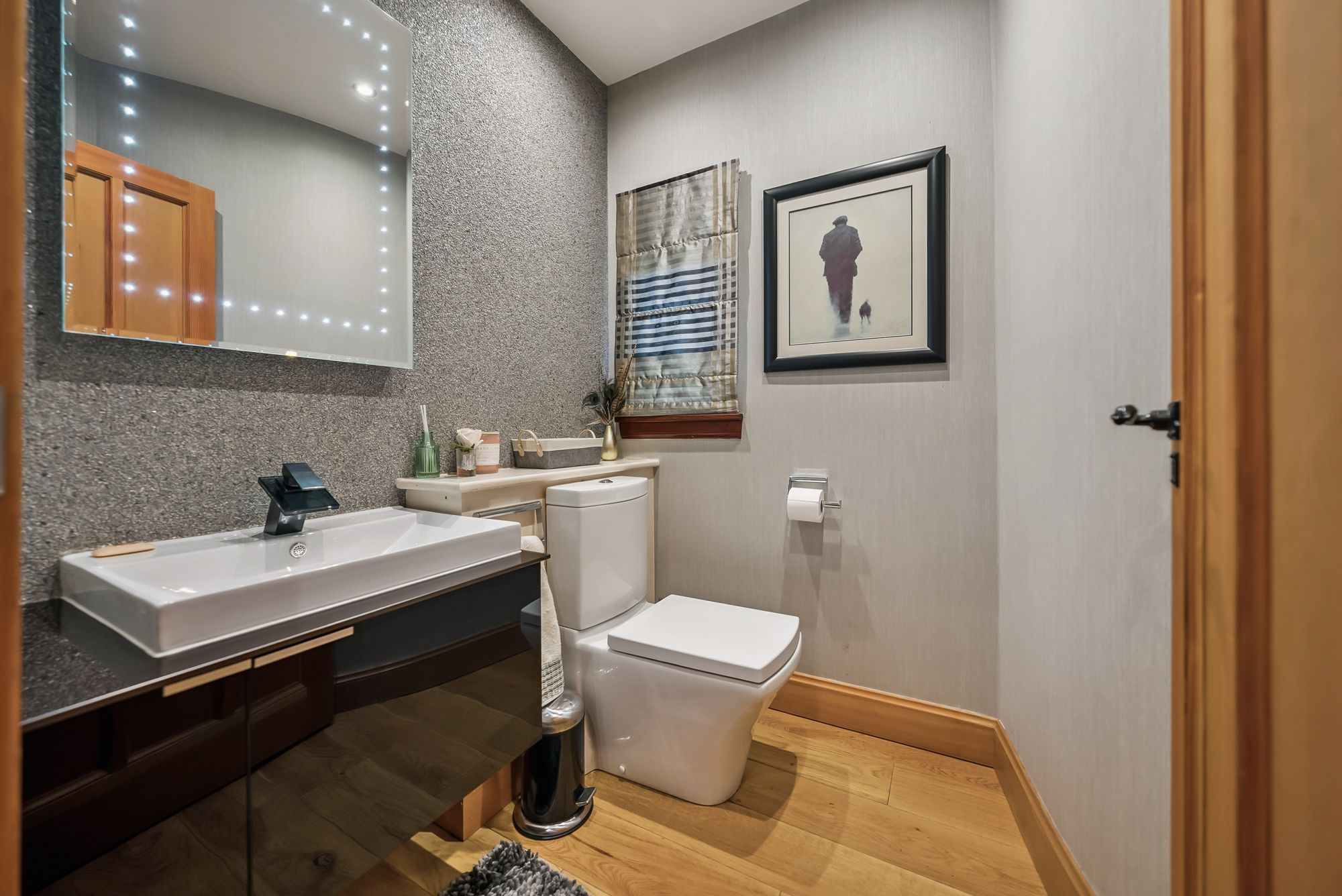The spiral staircase leads to the upper hall, where you access the expansive primary suite. This space features a balcony overlooking the loch and towards the Campsie Hills, a large dressing room, and a spacious en-suite bathroom. There are six further bedrooms, an en-suite bathroom, a family bathroom, shower room, and extensive storage. The upper level also provides a vast billiards / games room with bar and W/C, plus a useful additional kitchen.