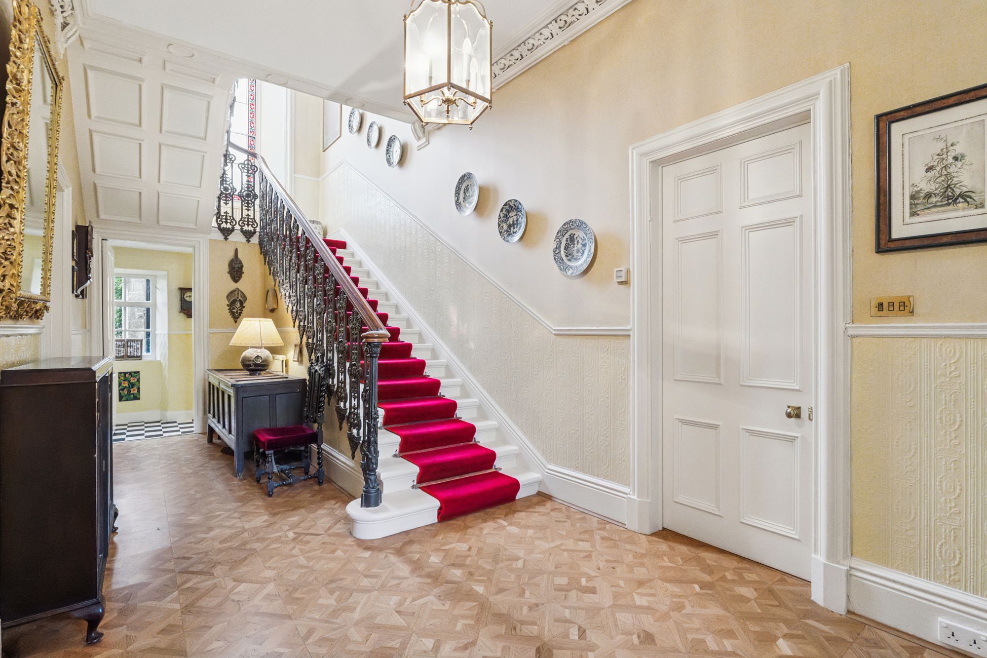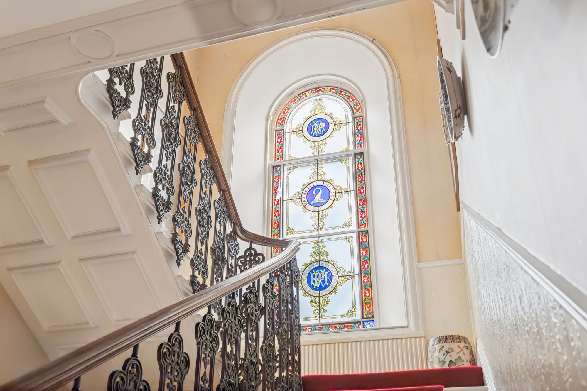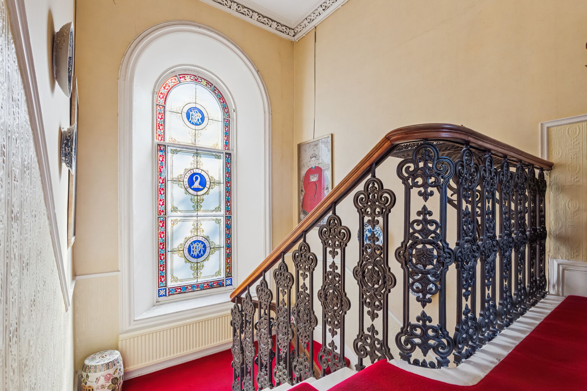 The grand stairs lead upwards and pass a magnificent stained-glass window emblazoned with this home's enduring moto 'Pro Rege et grege' - For King and flock. The stained glass also features the monogram of its builders and first family, R&R Patterson. This is a house with lineage. A spacious and useful landing leads to a drawing room with full height windows leading out to a small balcony over the front entrance. This grand room features the finest fireplace in the property. There are 3 large double bedrooms on this level, family bathroom and storage space.