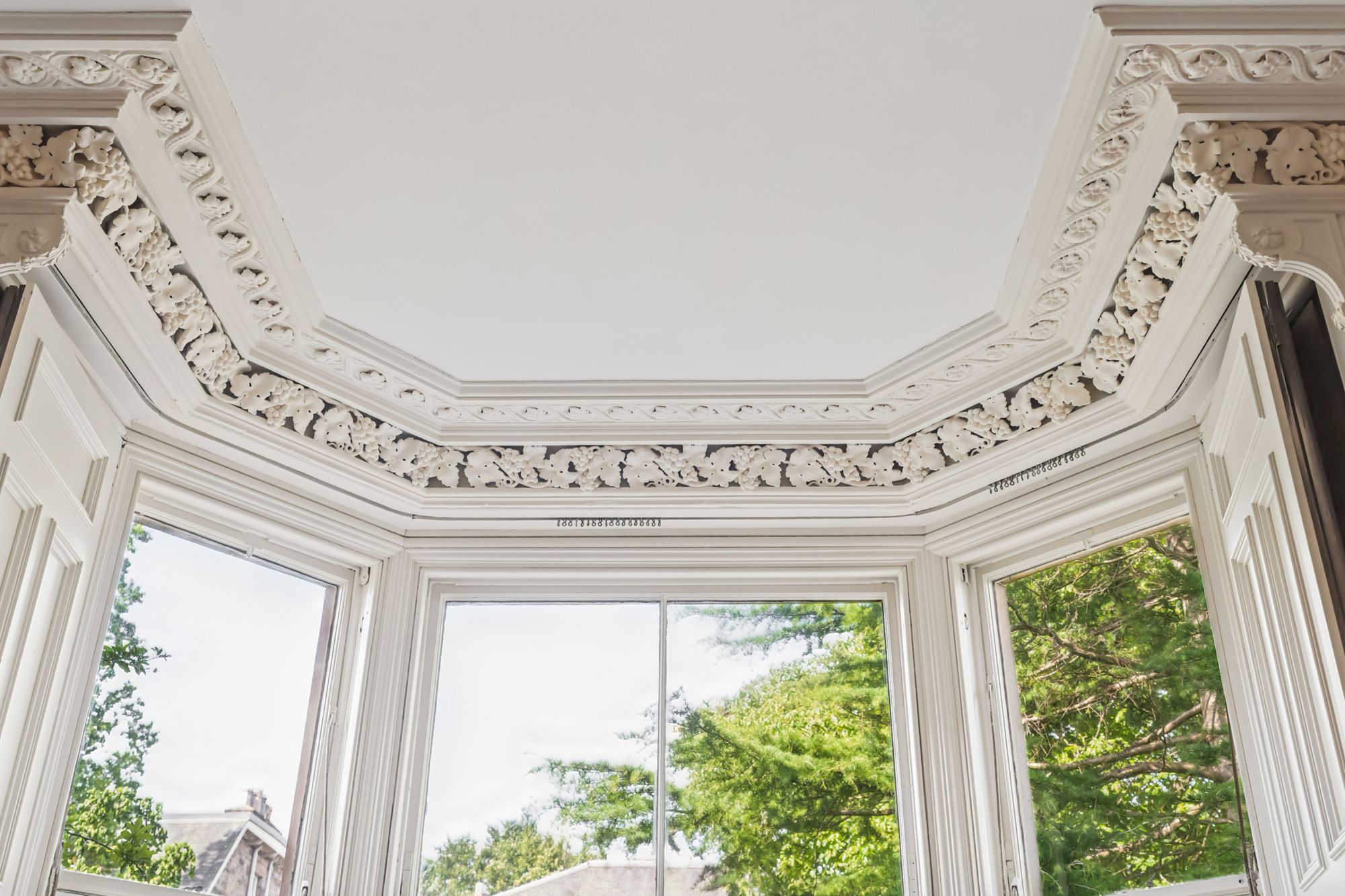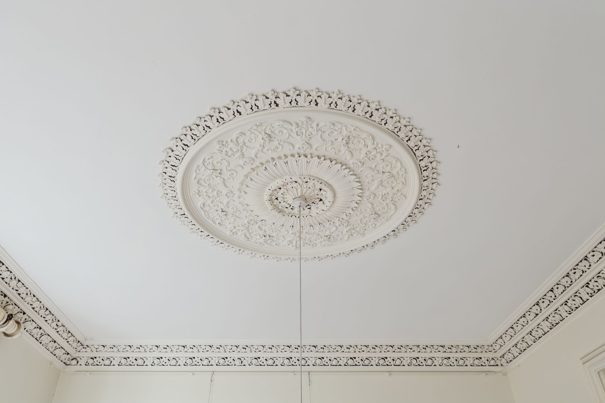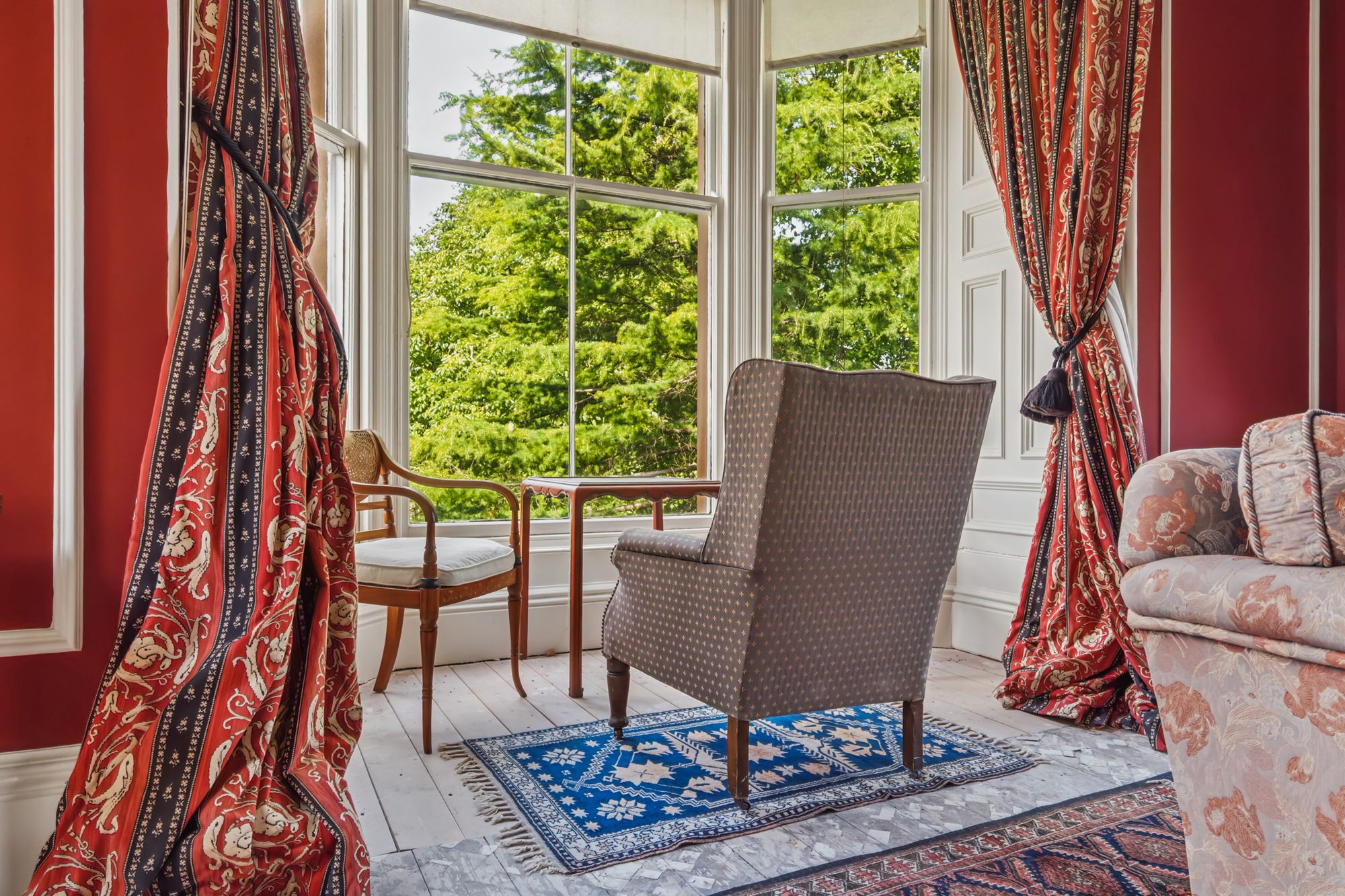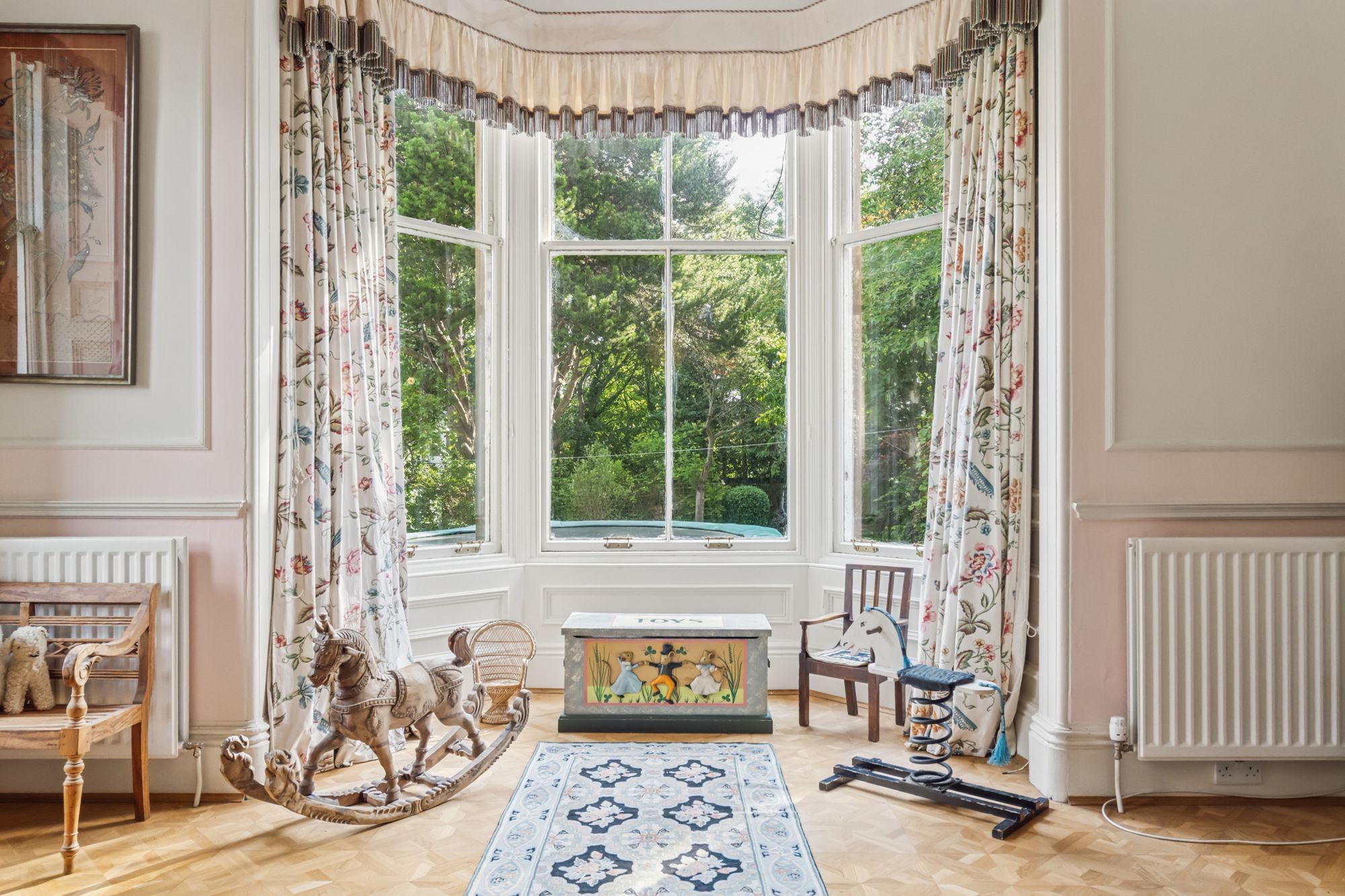 The grand stairs lead upwards and pass a magnificent stained-glass window emblazoned with this home's enduring moto 'Pro Rege et grege' - For King and flock. The stained glass also features the monogram of its builders and first family, R&R Patterson. This is a house with lineage. A spacious and useful landing leads to a drawing room with full height windows leading out to a small balcony over the front entrance. This grand room features the finest fireplace in the property. There are 3 large double bedrooms on this level, family bathroom and storage space.