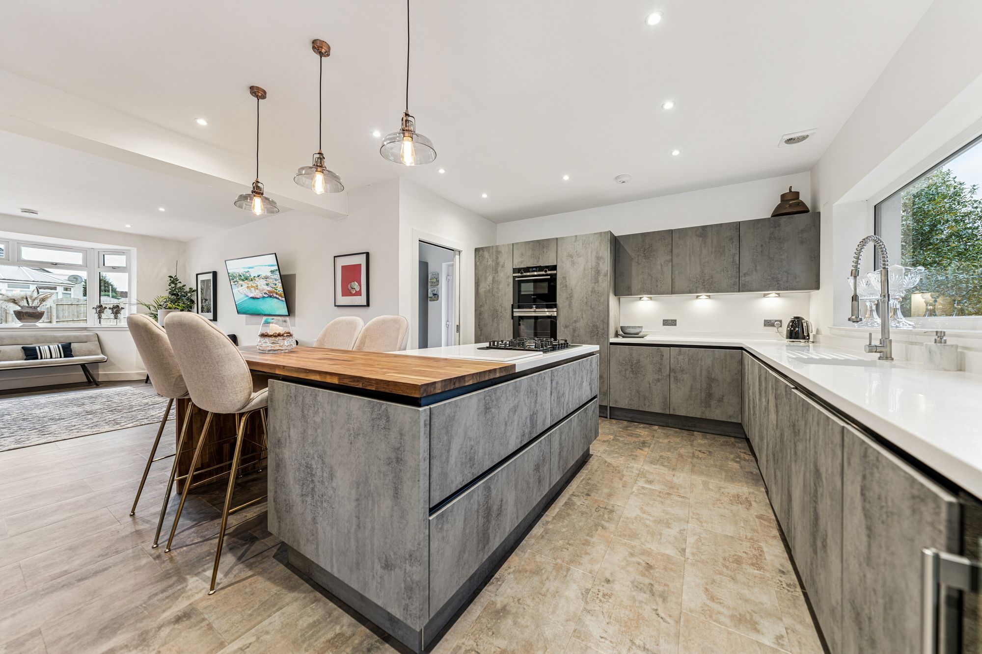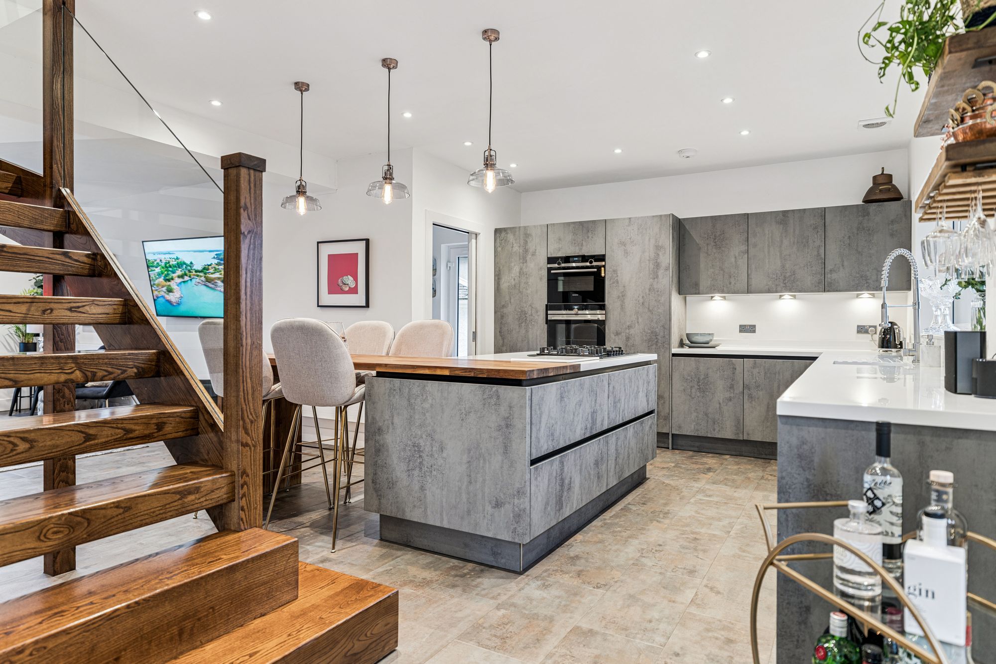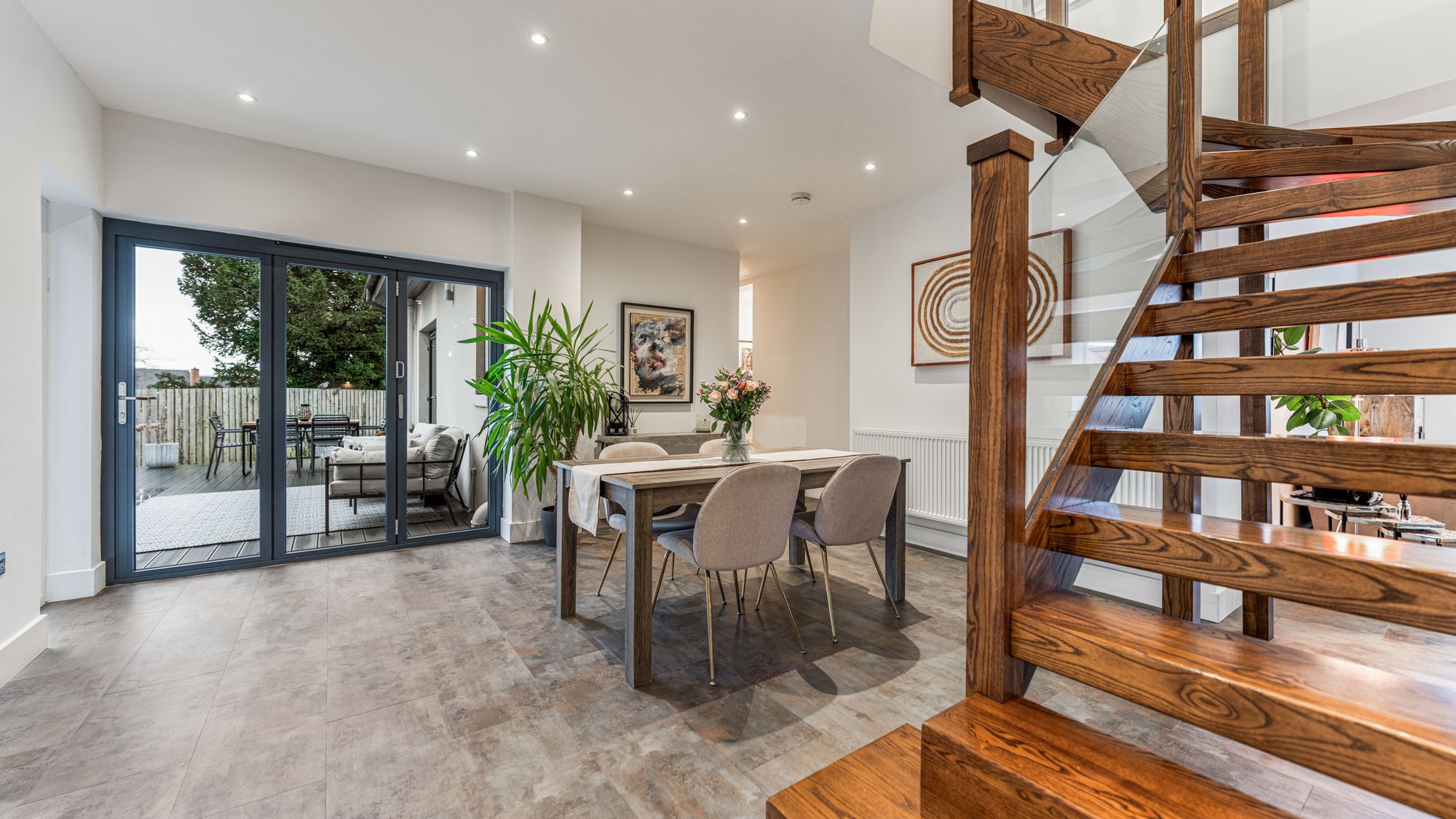 The welcoming ‘L’ shaped reception hall way is floored with ornate tiling and provides access to the main ground floor apartments which includes an impressive formal lounge which spans the depth of the property with a bay window to the front and patio doors to the rear, a fabulous and versatile downstairs bedroom, again, featuring a bay window and also including a beautifully finished ensuite shower room and a family bathroom which is fully tiled and comprises a fitted bath with shower above, WC and wash hand basin. The ‘heart of the home’ truly is the remarkable open plan kitchen/living/dining room which centres around an ornate, walnut staircase with glass balustrade leading to the upper level of the property and is bathed in light another bay window and bifolding doors. The kitchen boasts a luxurious specification with a central island and breakfasting bar, an abundance of quality integrated appliances, ample space for dining/living furniture and a separate utility room offers space for further free standing appliances, fitted storage and access to the garden.