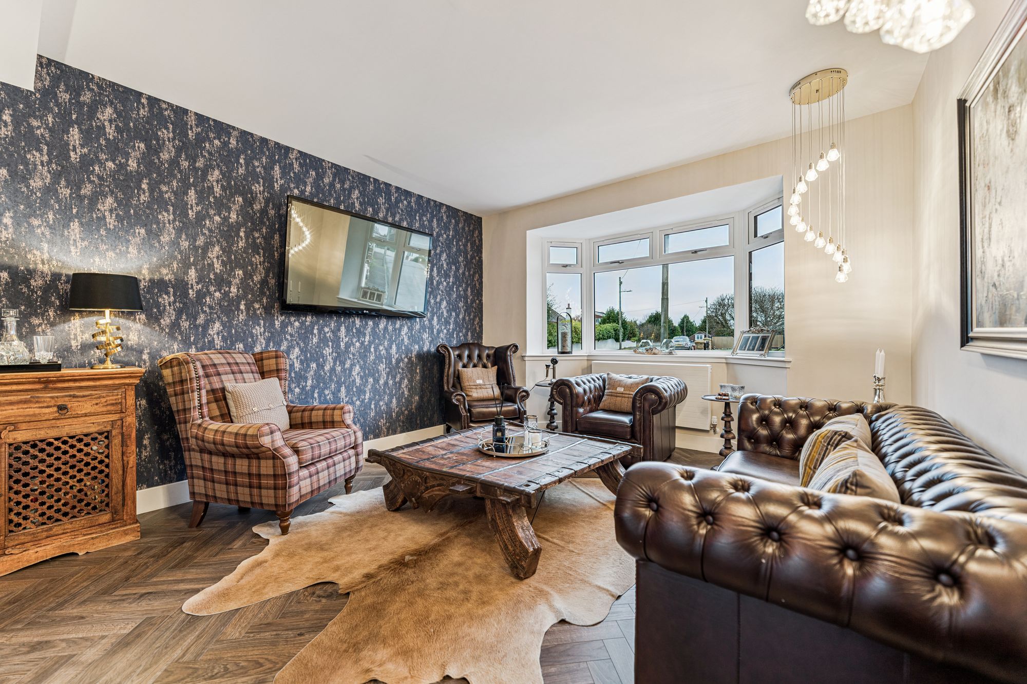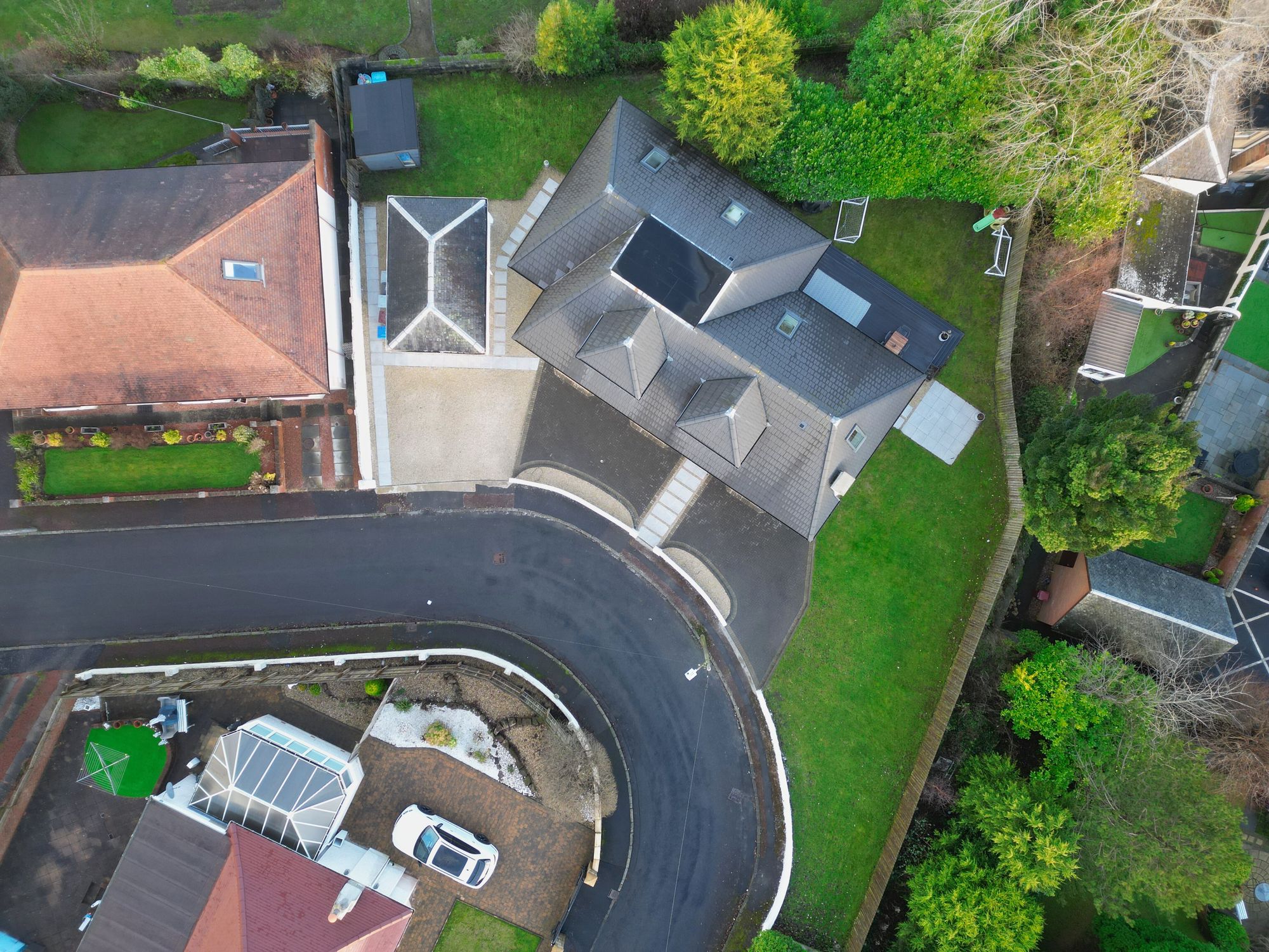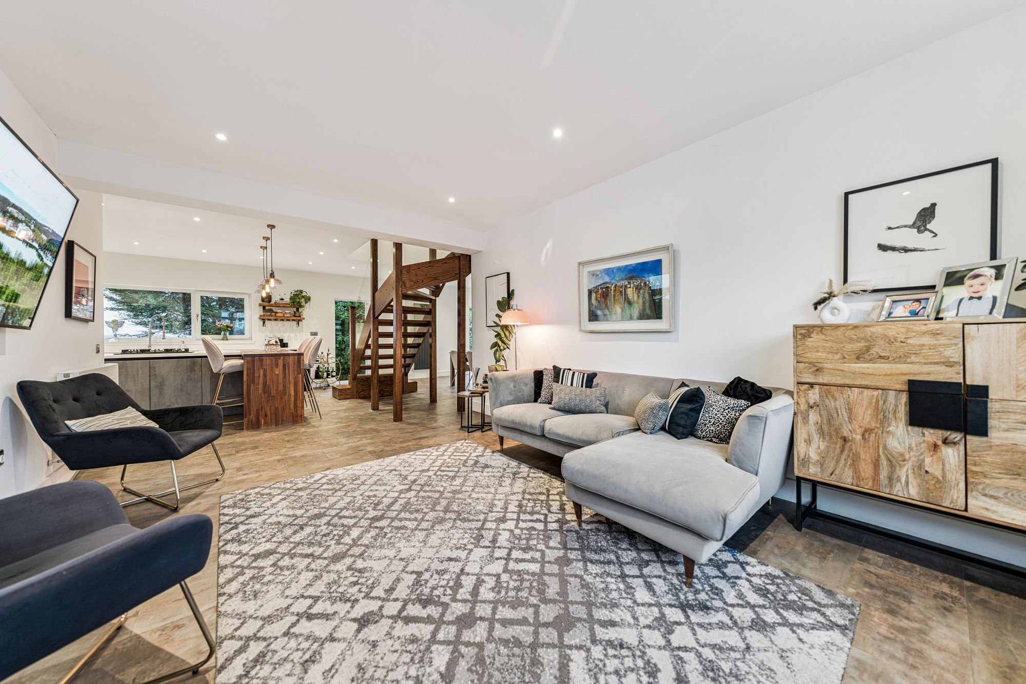Commanding a spacious plot, the property is surrounded by sweeping garden grounds with extensive driveway parking to the front leading to a detached garage. There is a large area of lawn which wraps around the home and features a patio as well as a broad, composite decking area adjacent to the bifolding doors from the kitchen and a timber built garden room.