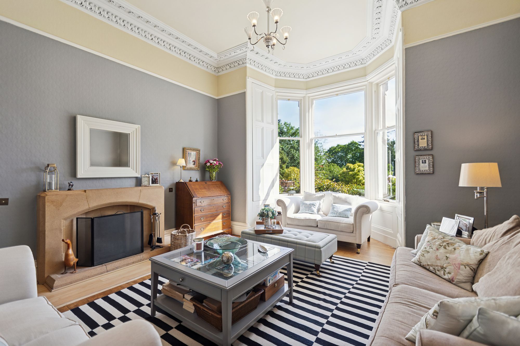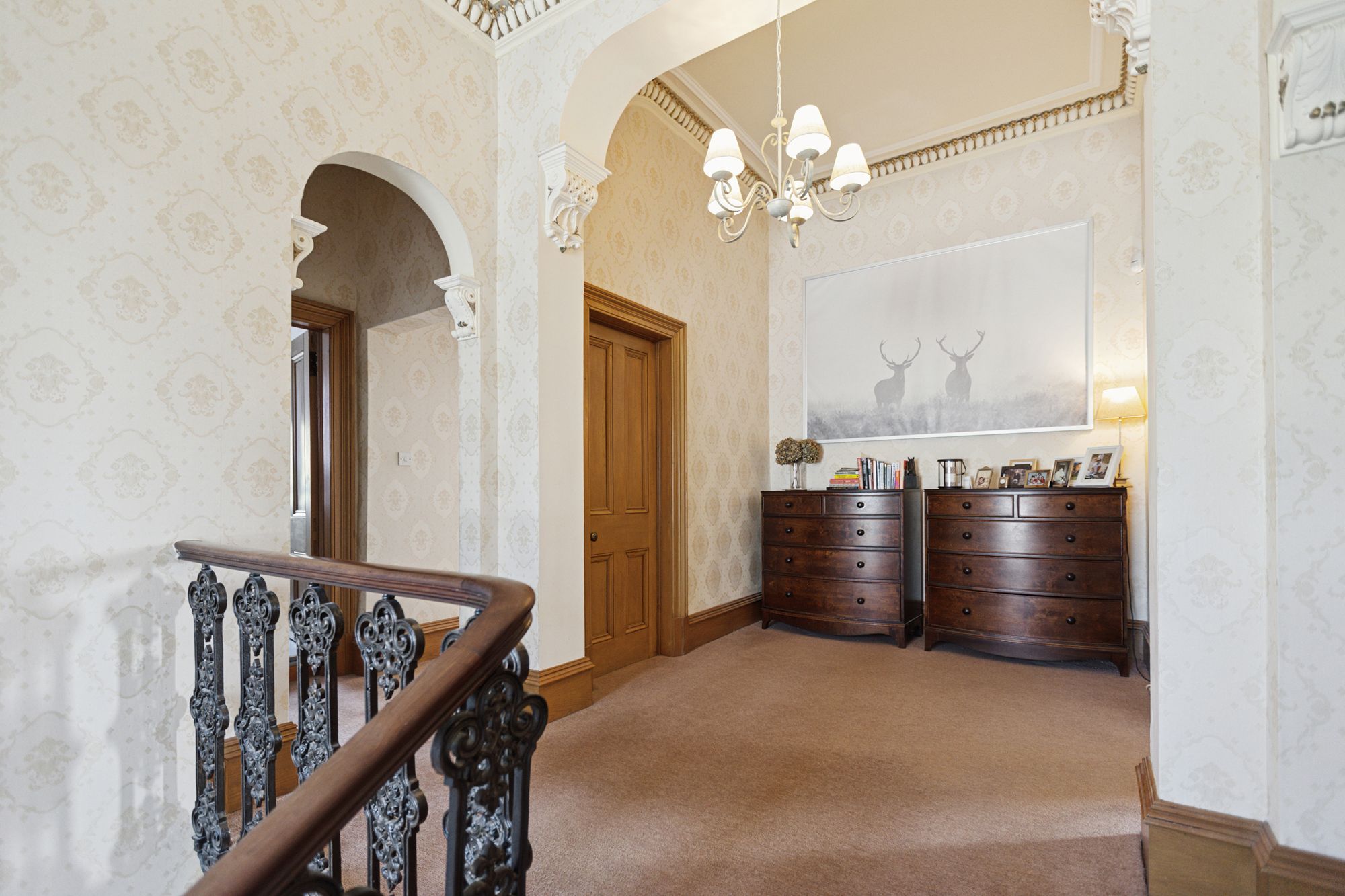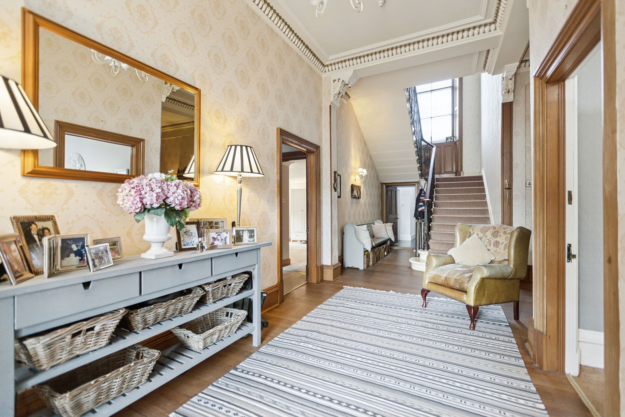 On entering the property, a covered outer portico leads through to an entrance vestibule which in turn opens in to the impressive formal hallway. It features a grand staircase to the upper landing with wrought iron railings and handrail. To the front of the house and currently used as a family room, is a magnificent bay windowed public room with feature fireplace and open fire and with intact ceiling cornicing and centre rose. On the other side of the hall is an additional bay windowed drawing room. To the rear of the main family room is a very useful and spacious downstairs study which has built-in cupboard space and from here an internal doors leads through to a vestibule at the side of the house with a door out to the gardens and a secondary staircase ascending to the upper floor, with a bedroom on the half landing. This bedroom has a window to the side of the house.