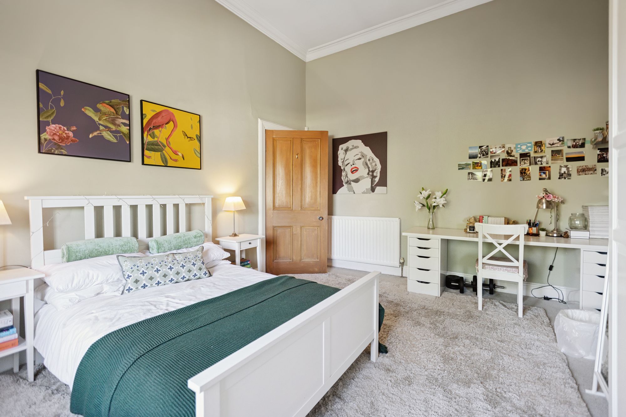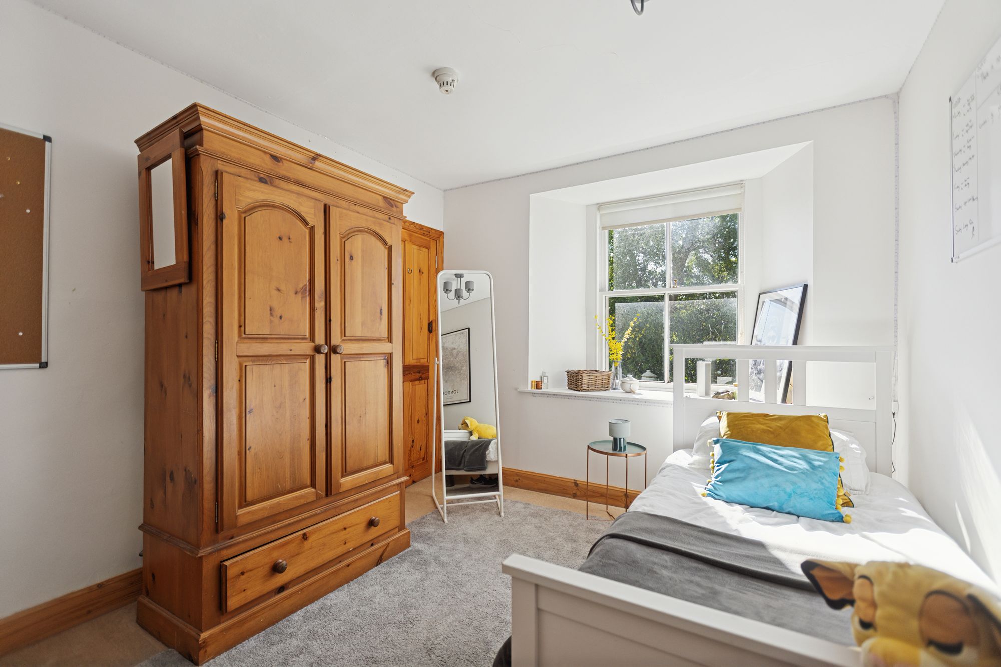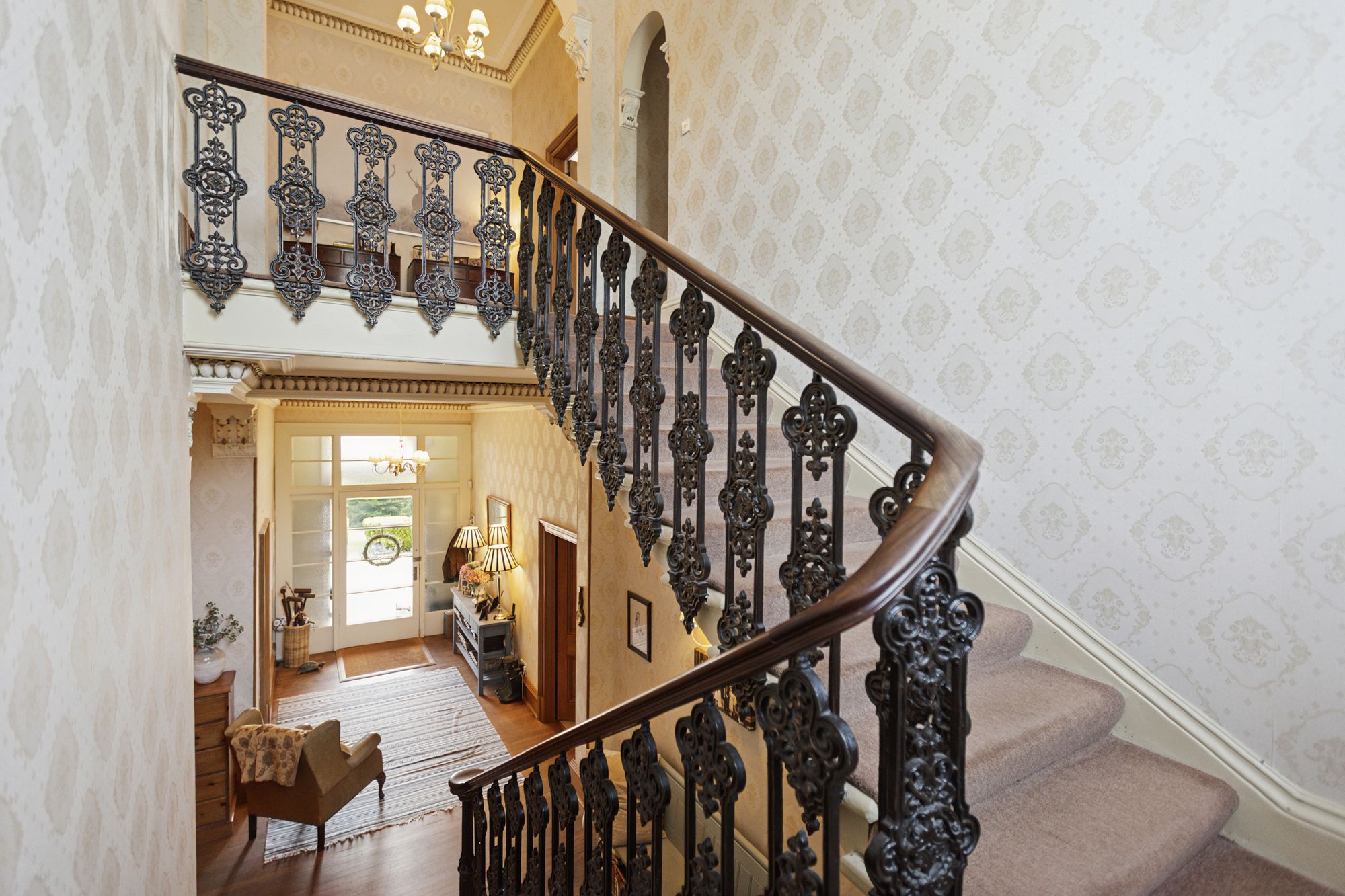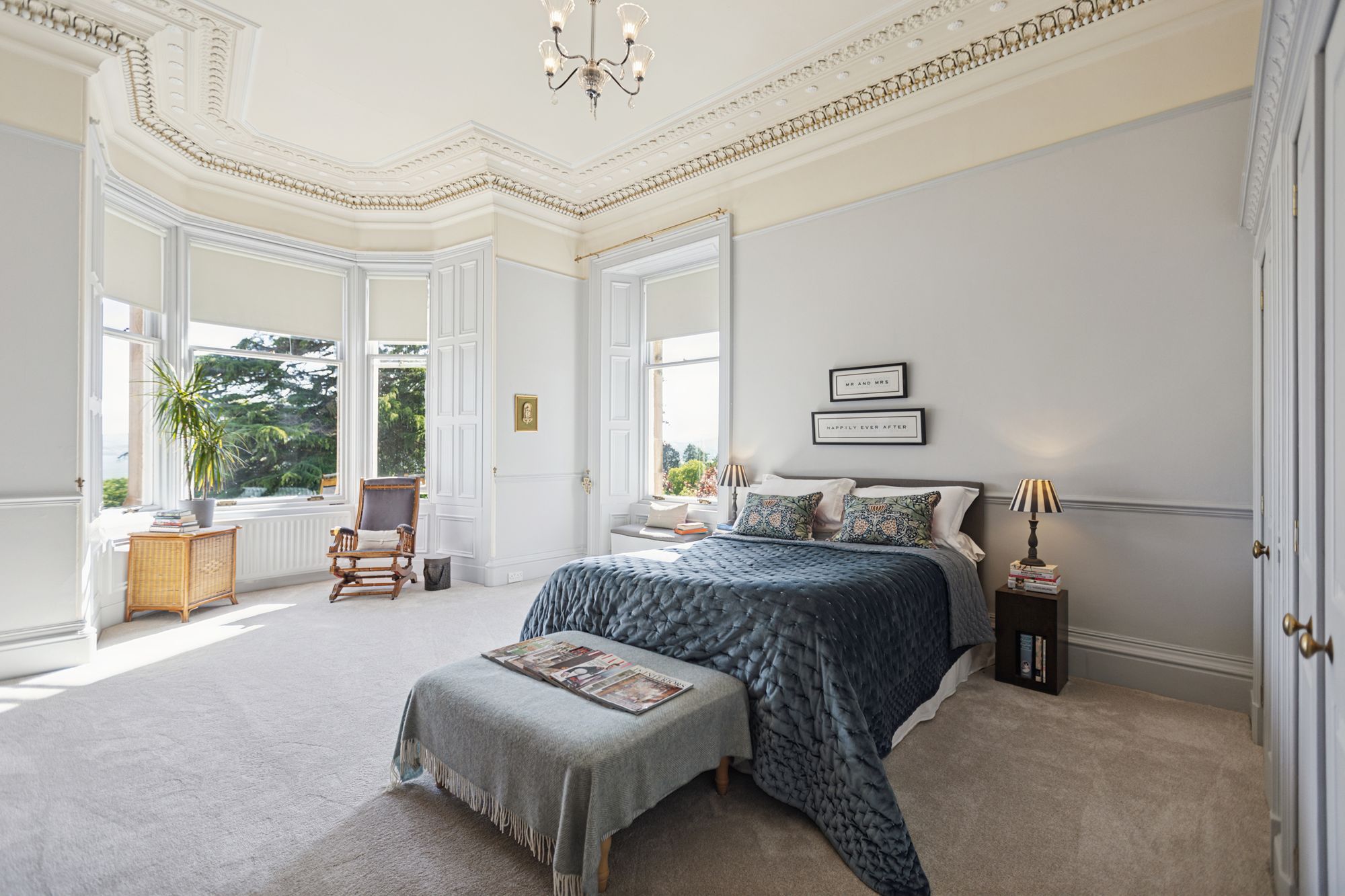 On entering the property, a covered outer portico leads through to an entrance vestibule which in turn opens in to the impressive formal hallway. It features a grand staircase to the upper landing with wrought iron railings and handrail. To the front of the house and currently used as a family room, is a magnificent bay windowed public room with feature fireplace and open fire and with intact ceiling cornicing and centre rose. On the other side of the hall is an additional bay windowed drawing room. To the rear of the main family room is a very useful and spacious downstairs study which has built-in cupboard space and from here an internal doors leads through to a vestibule at the side of the house with a door out to the gardens and a secondary staircase ascending to the upper floor, with a bedroom on the half landing. This bedroom has a window to the side of the house.