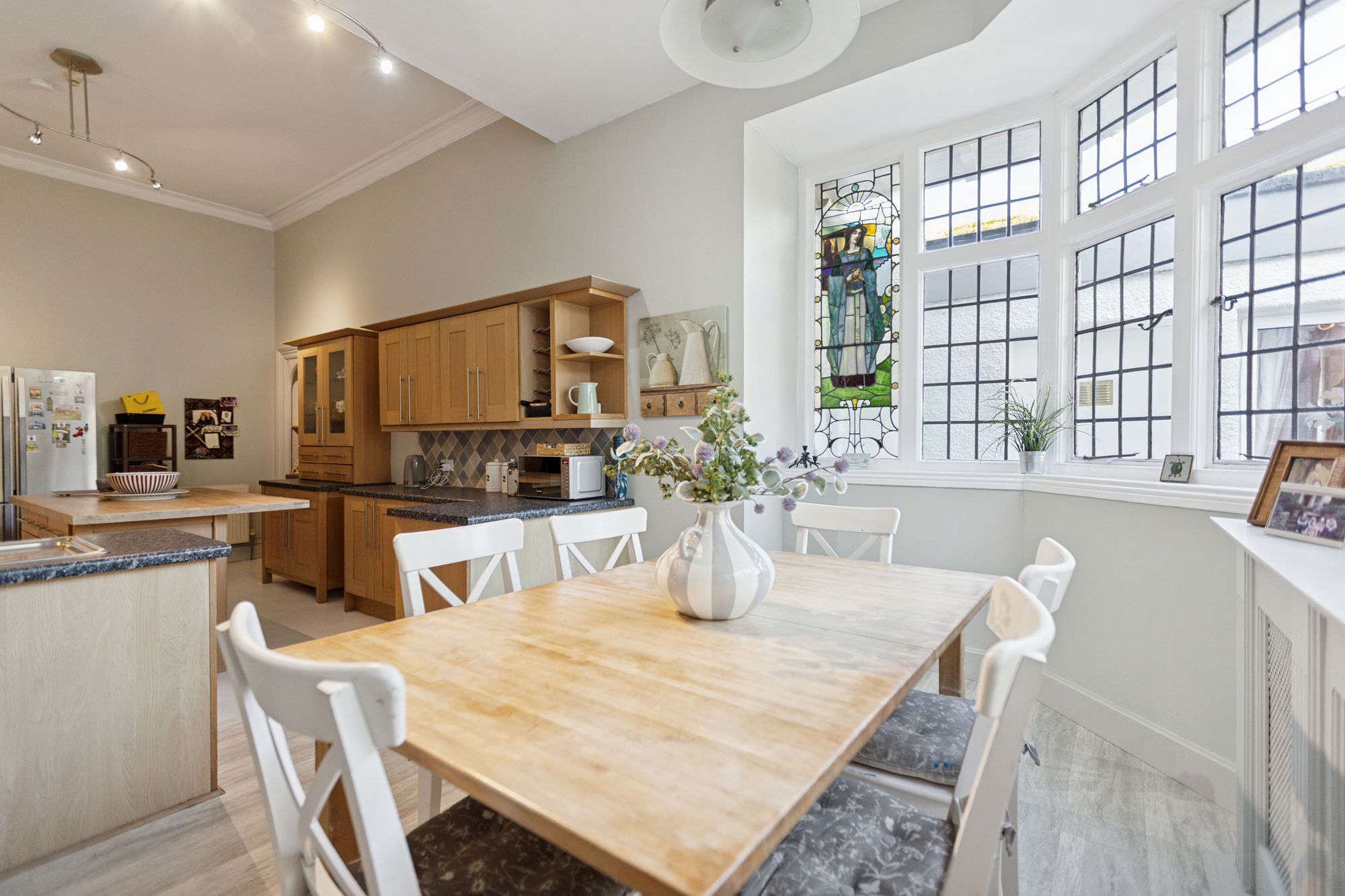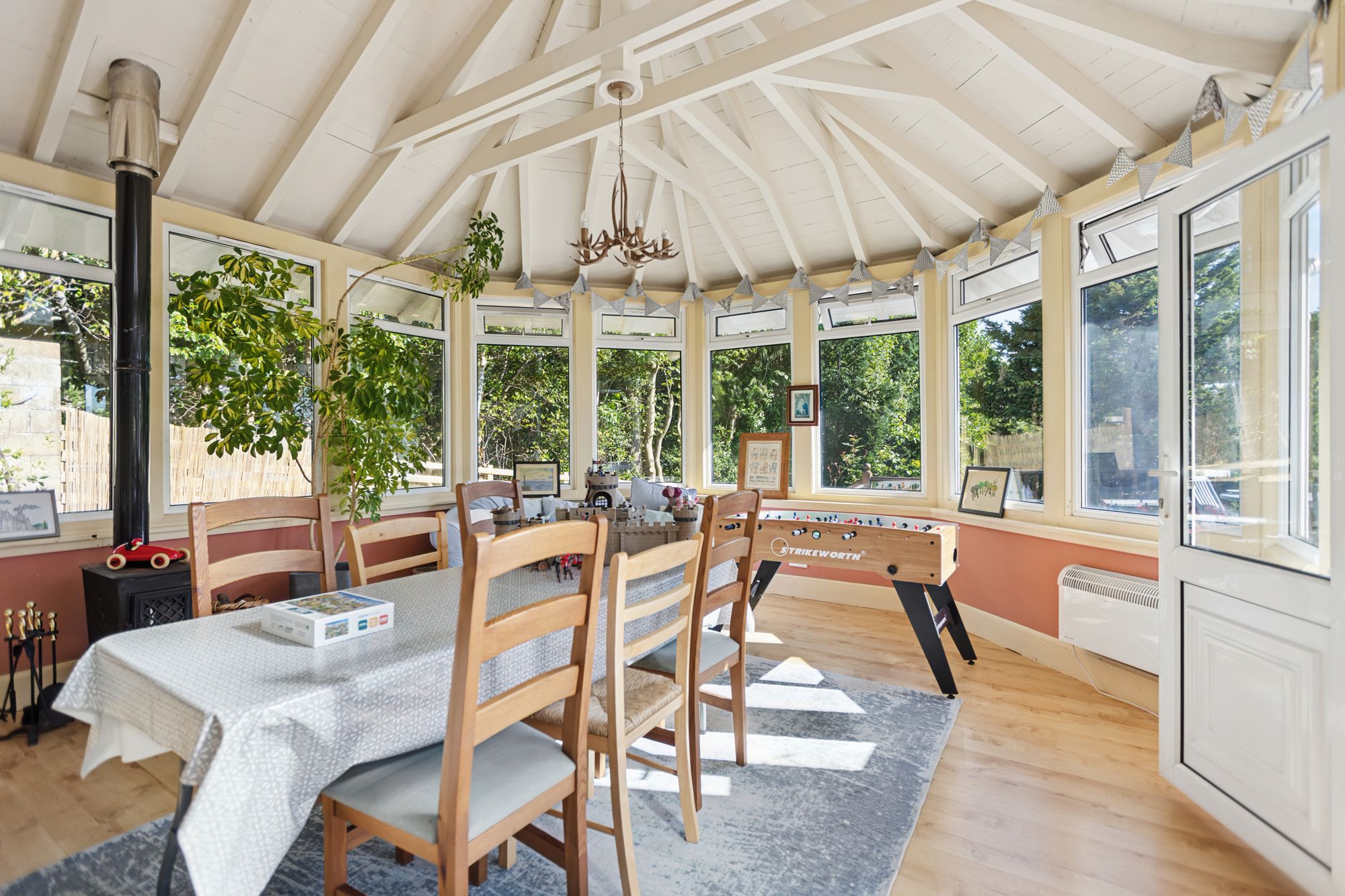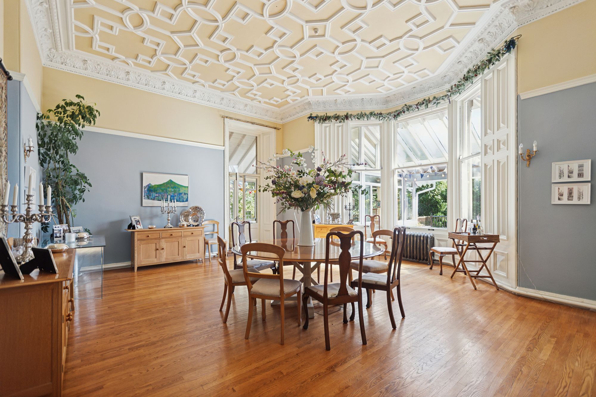 Moving back to the main reception hall, a door to the side of the hall leads through to what was the original drawing room of the property which is currently used as a grand dining room. It is a stunning formal room and a spacious part of the house with intricately decorated ceiling, a bay window to the front and with access from here through to the garden room/conservatory. This is a large space that features a beamed timber ceiling, woodburner and with access out to the decked terrace. To the rear of this room is a large and very useful utility room which has a built-in cupboard area at the far end and allows access out to the rear garden.