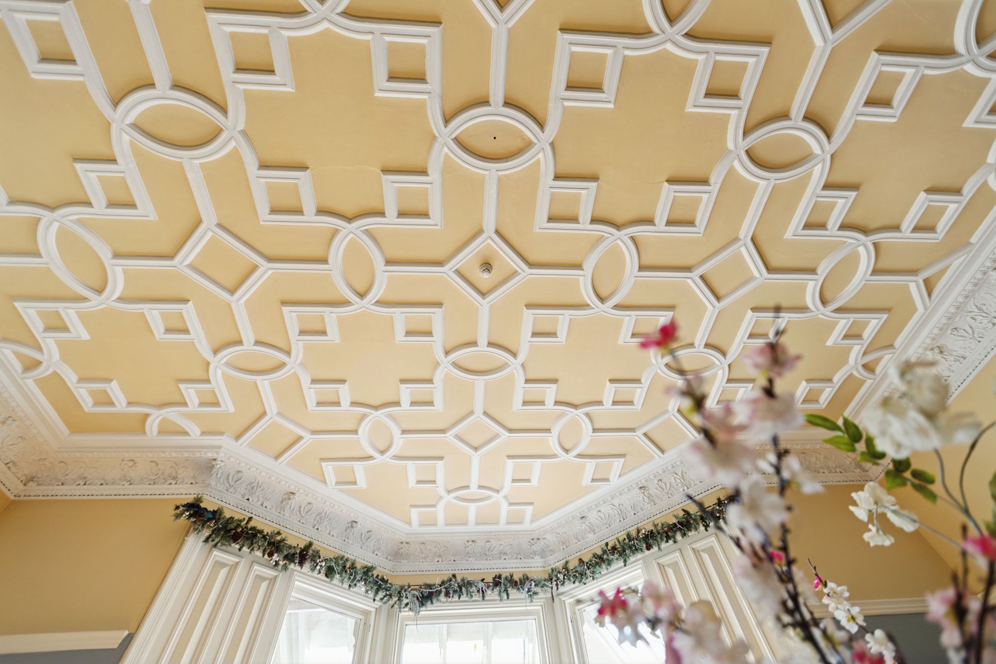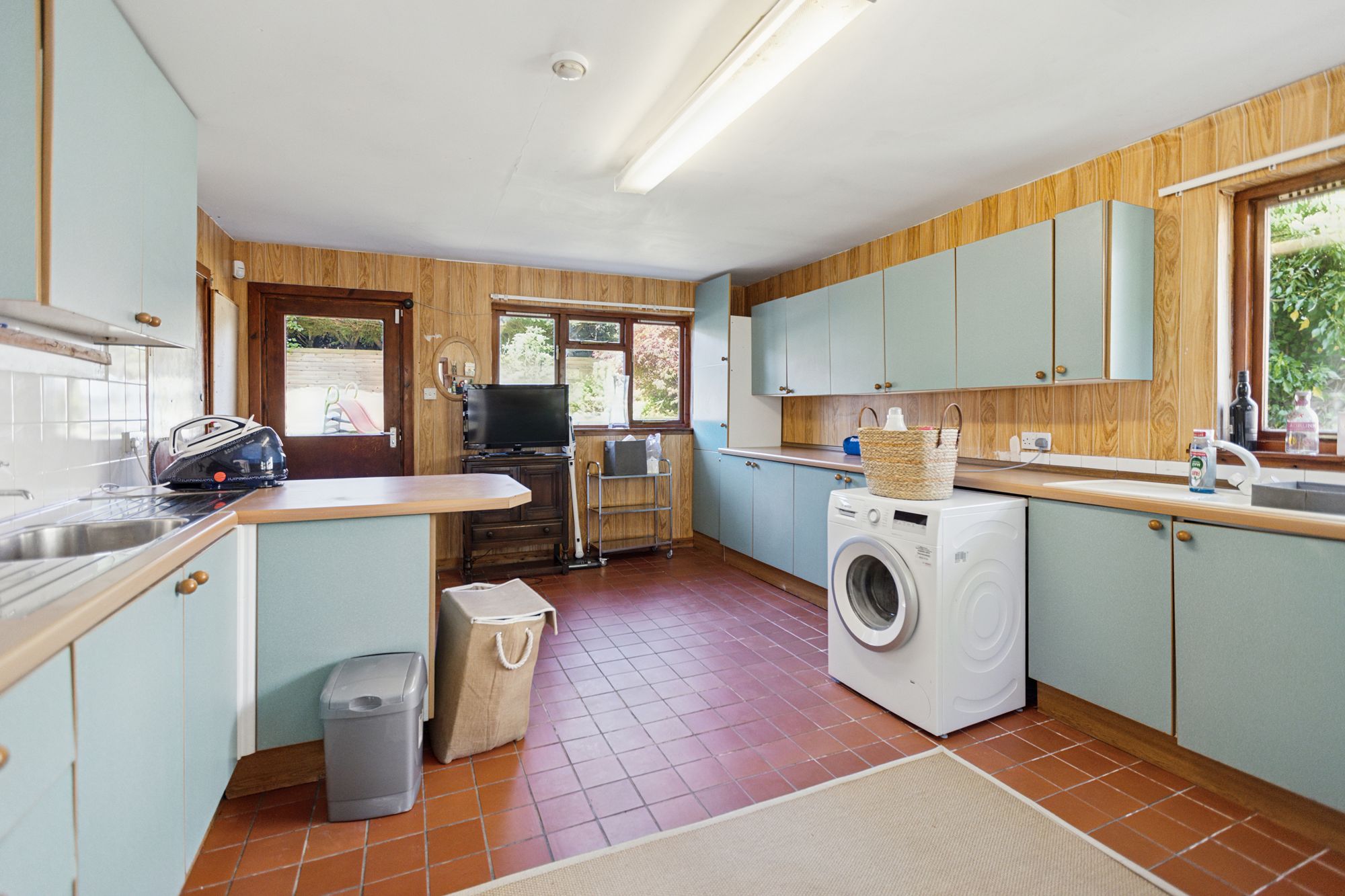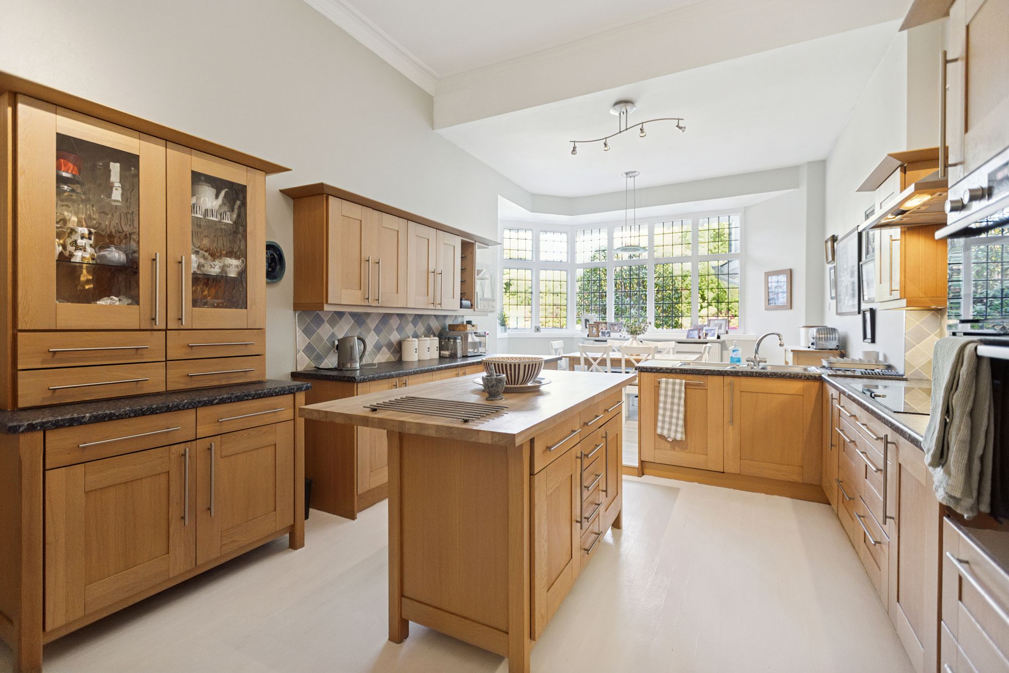 Moving back to the main reception hall, a door to the side of the hall leads through to what was the original drawing room of the property which is currently used as a grand dining room. It is a stunning formal room and a spacious part of the house with intricately decorated ceiling, a bay window to the front and with access from here through to the garden room/conservatory. This is a large space that features a beamed timber ceiling, woodburner and with access out to the decked terrace. To the rear of this room is a large and very useful utility room which has a built-in cupboard area at the far end and allows access out to the rear garden.