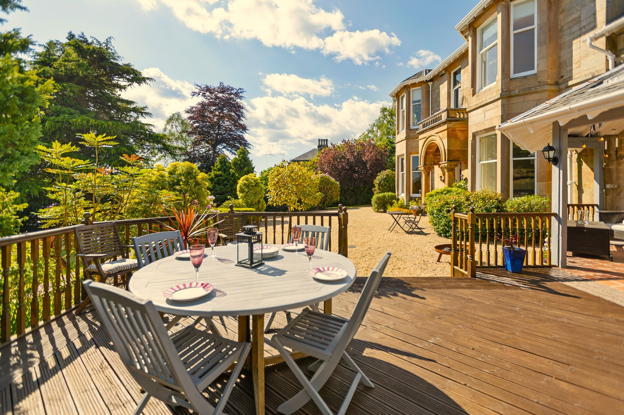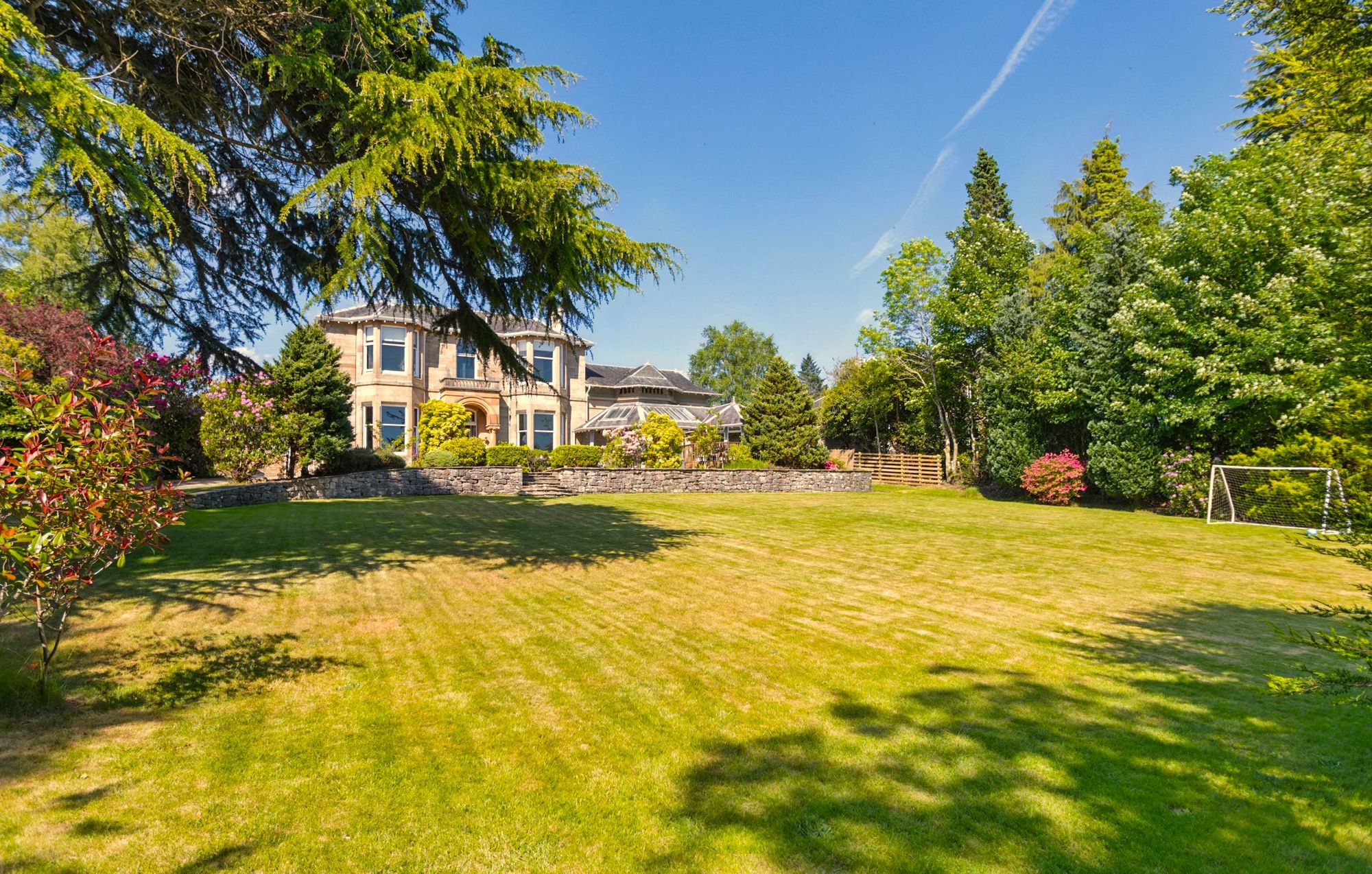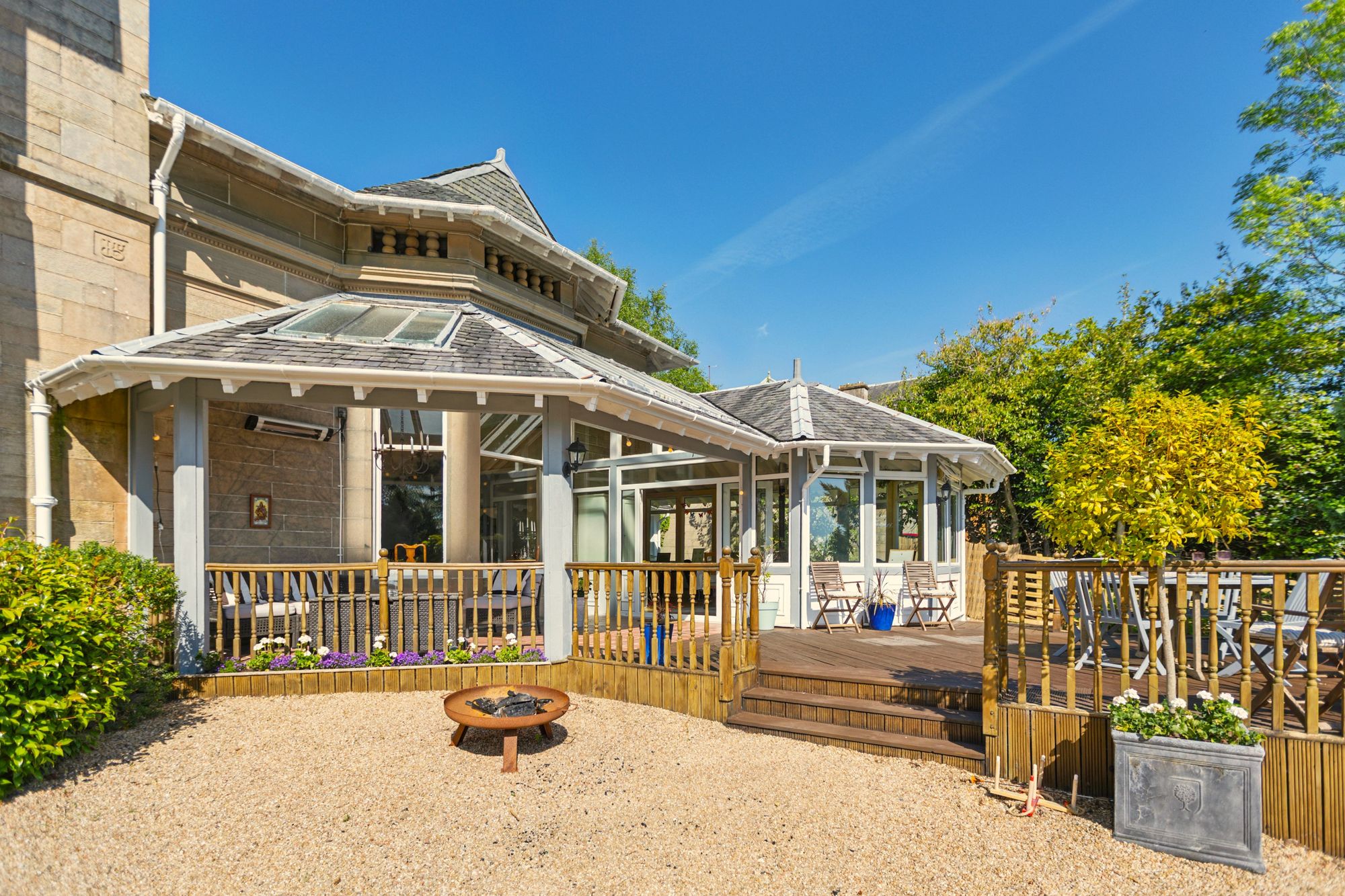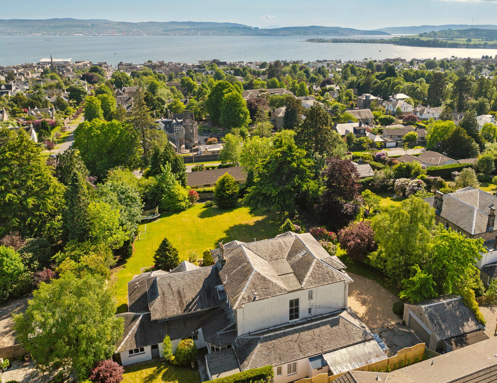 On entering the grounds from Queen Street, a sweeping driveway leads up to the property with extensive gravelled parking areas to the front and side of the house leading to the garage. The large expanse of lawn to the front features mature trees with screening and privacy provided by hedging, bushes and shrubs on the periphery. The large raised timber decked terrace can be accessed from the front gardens or the garden room and this is a fantastic place for entertaining, enjoying all day long sunshine and the magnificent views. The garden to the rear is completely sheltered, and again lawned for ease of maintenance and enjoys afternoon and evening sunshine.