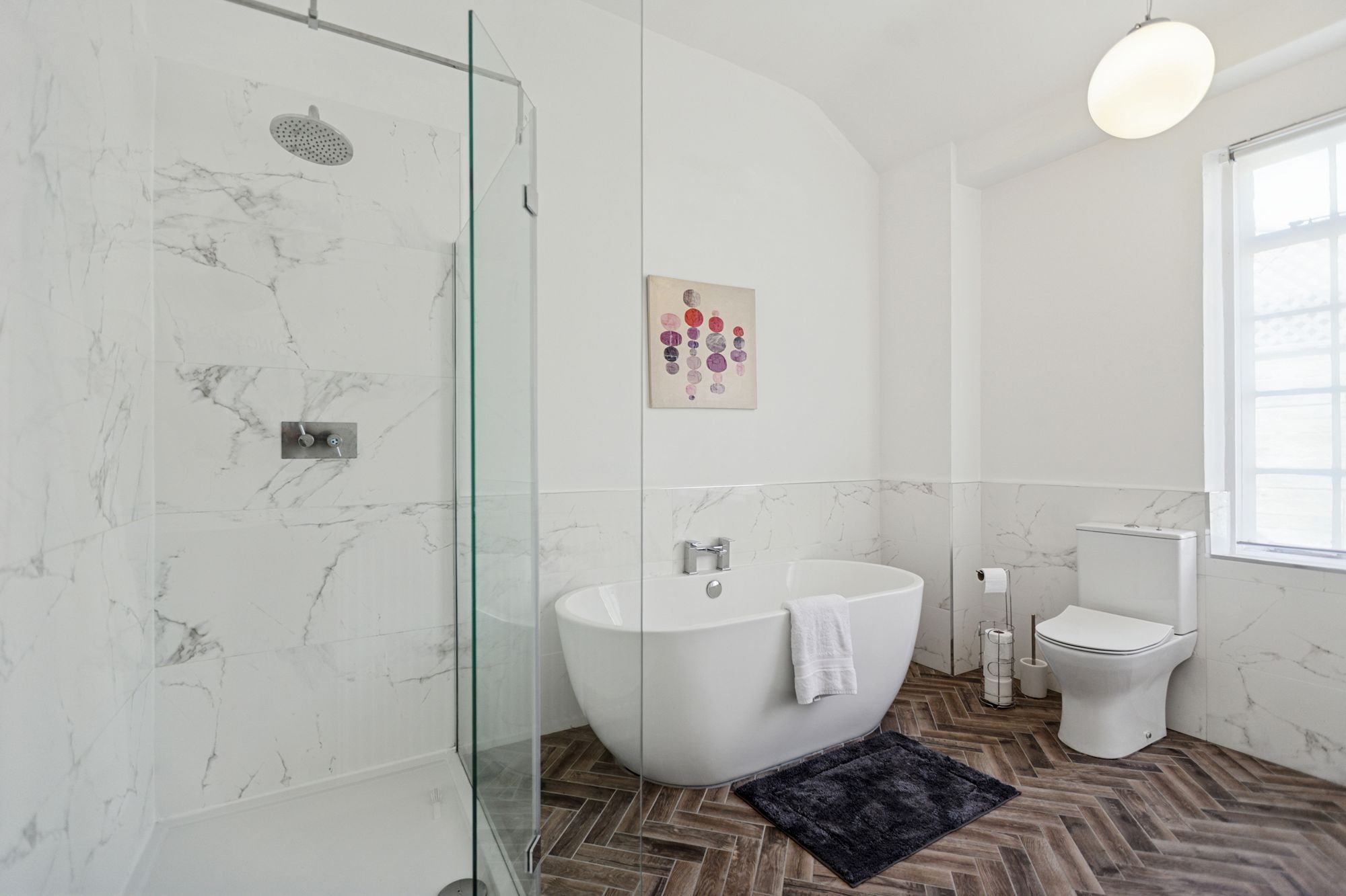 Moving back to the main reception hall, to the rear of the hall is a spectacular open plan kitchen with dining/breakfast room area featuring leaded glass windows to the side of the house and with the kitchen fitted with extensive wall mounted and counter level units and a range of appliances. Once again, from the reception hall a door opens into a downstairs bathroom with bath, vanity wash hand basin and wc. At the far end of the reception hall, there is access into the rear annex of the property which has been thoughtfully laid out with an additional two bedrooms in this space. These bedrooms are served by a beautifully refitted and luxurious bathroom (with separate shower enclosure) and two refitted shower rooms, all by Porcelanosa.