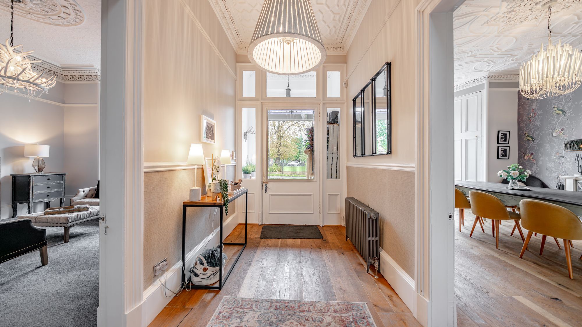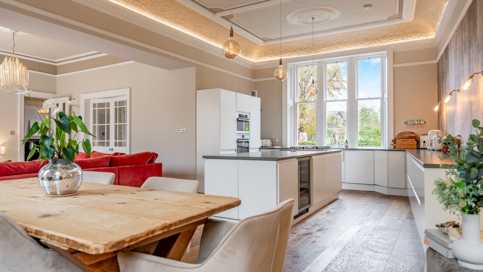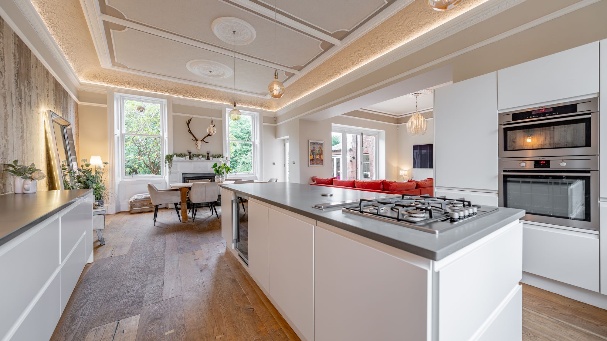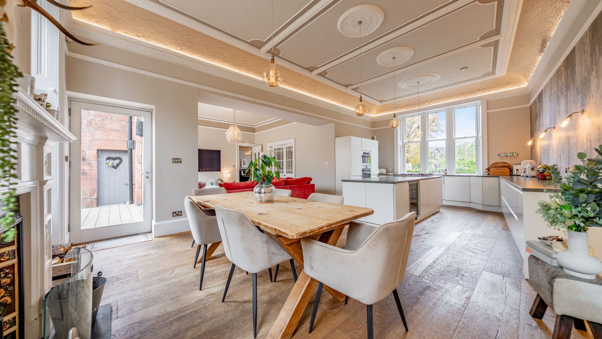 Ornate masonry frames the original storm door which opens in to the entrance vestibule with the number ‘16’ adorned in stained glass above. The quality and care taken in restoring this property is abundantly clear as you are met with intricate ceiling cornice and the original balustrade wrapping around the staircase leading to the upper level. The ground floor accommodation comprises of a large, bay windowed lounge with log burning stove, a similarly sized and equally impressive dining room with double doors opening in to the stunning ‘heart of the home’ - the open plan kitchen/dining/sitting room which boasts bi folding doors opening in to the rear garden accompanied by an abundance of natural light from an array of large windows and a stunning fitted kitchen complete with a large central island, state of the art integrated appliances and extensive work top space.