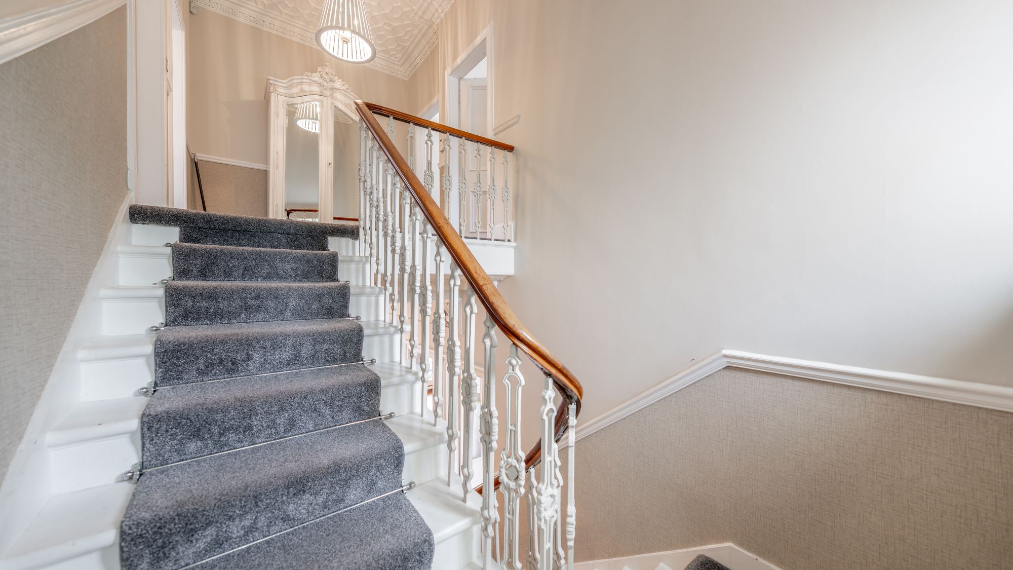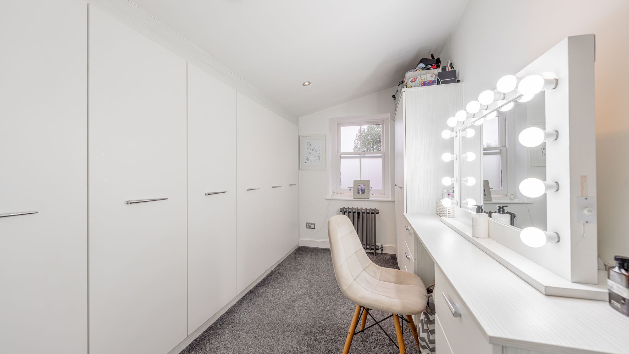 On the half landing is a well appointed dressing room boasting a full wall of fitted wardrobe storage and access to a shower room. The remaining bedrooms are positioned on the upper level with the principal benefitting from a large ensuite bathroom complete with walk in shower, WC and wash hand basin, complemented by stylish floor and wall tiling. Bedroom two and three feature fitted wardrobe storage and share a ‘Jack and Jill’ ensuite shower room and bedroom four has similar fitted wardrobe storage.