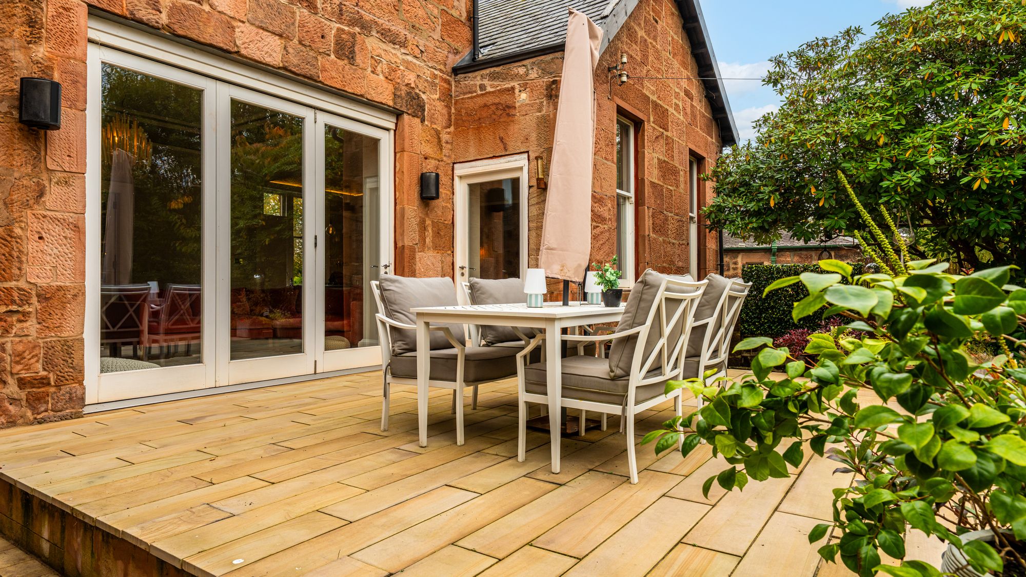 The property sits behind a stone pillared entrance opening in to a monobloc driveway providing ample off street parking for multiple vehicles and leading to the detached double garage in the rear garden. The rear garden has a broad patio area adjacent to the bifolding doors - ideal for outside entertaining - over looking an extensive area of lawn. There are well maintained and enclosed residents gardens to the front of the address shared by the neighbouring properties.