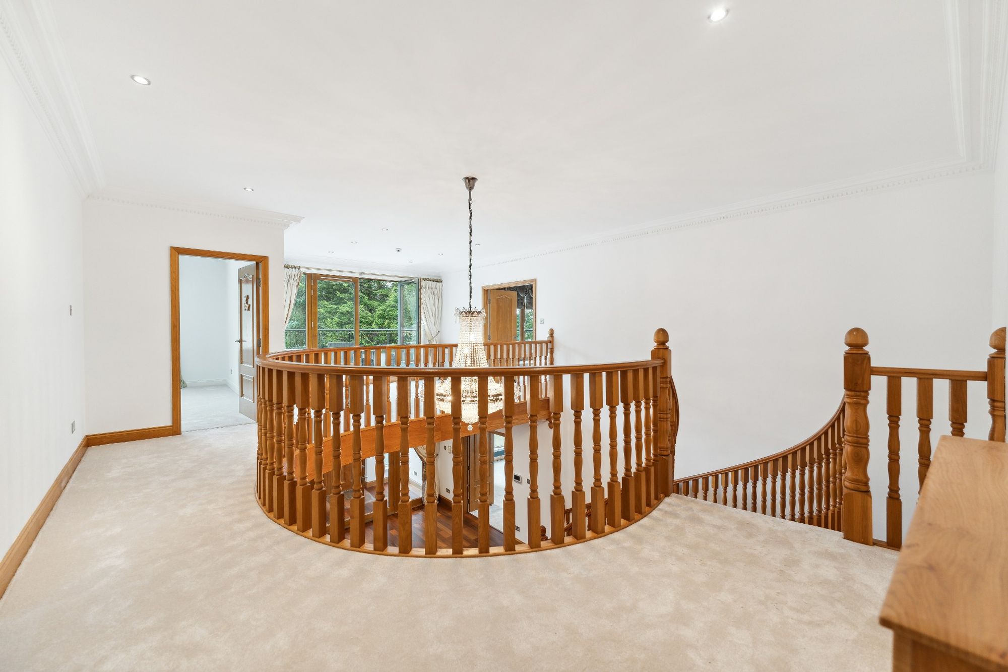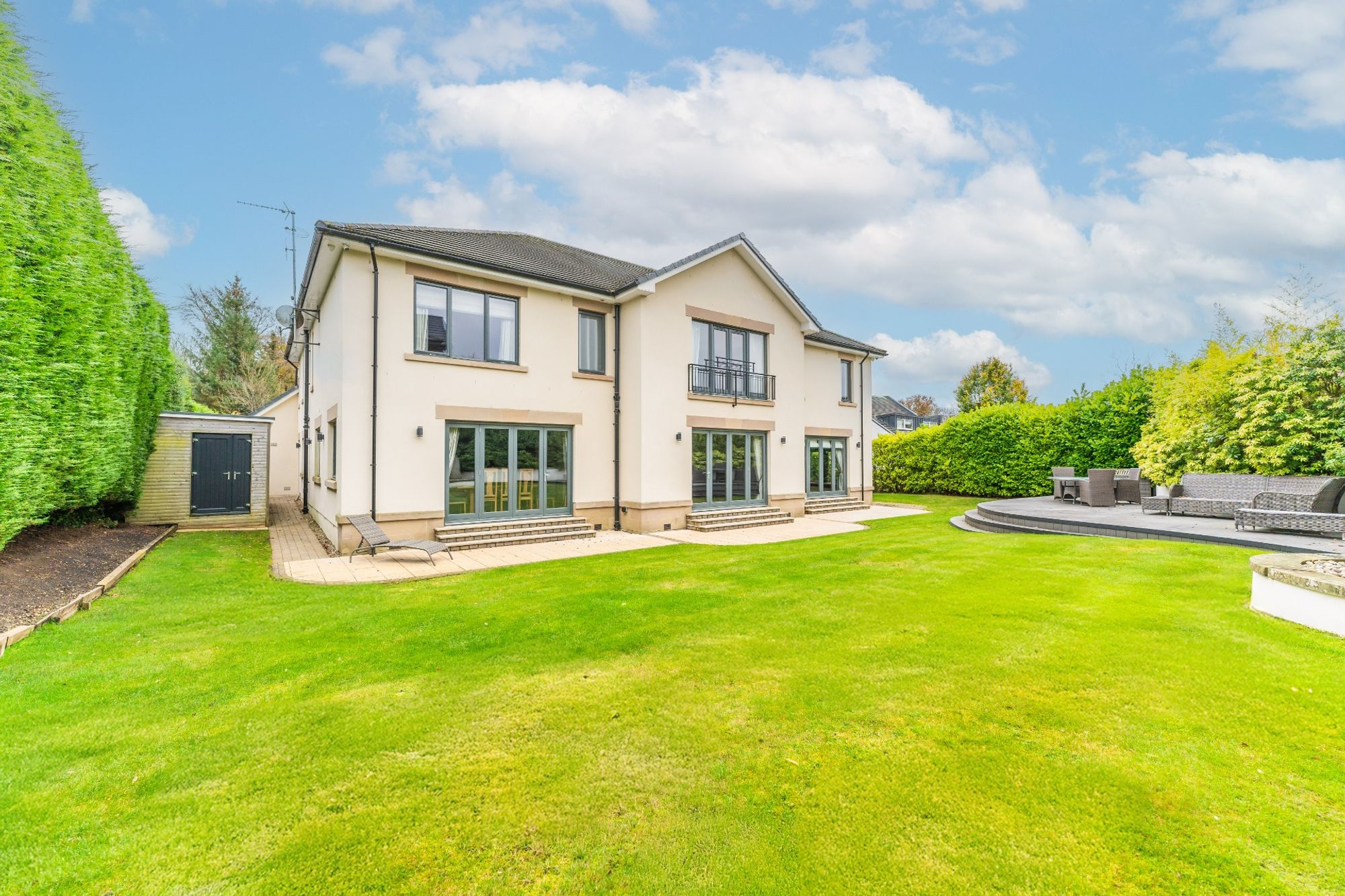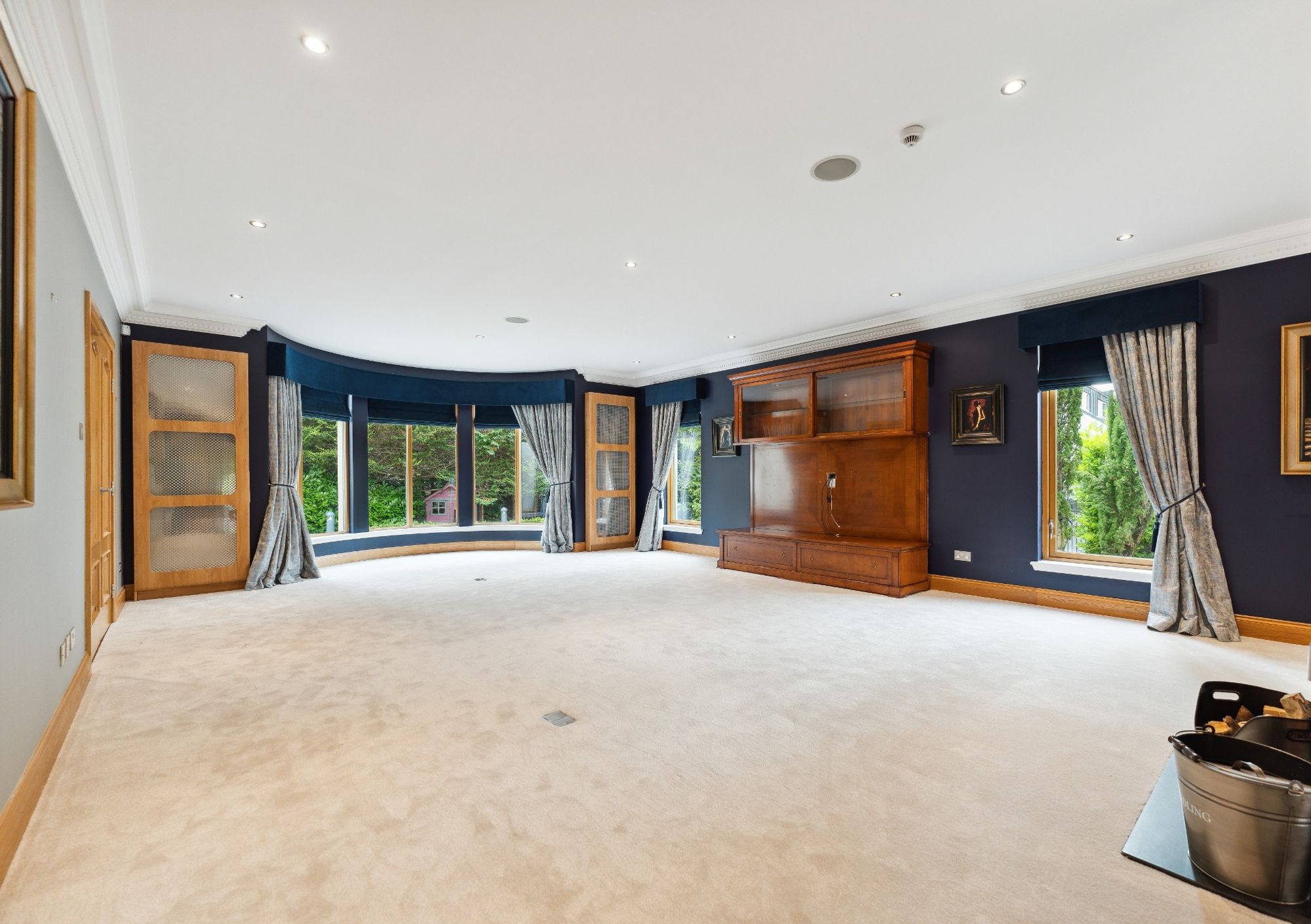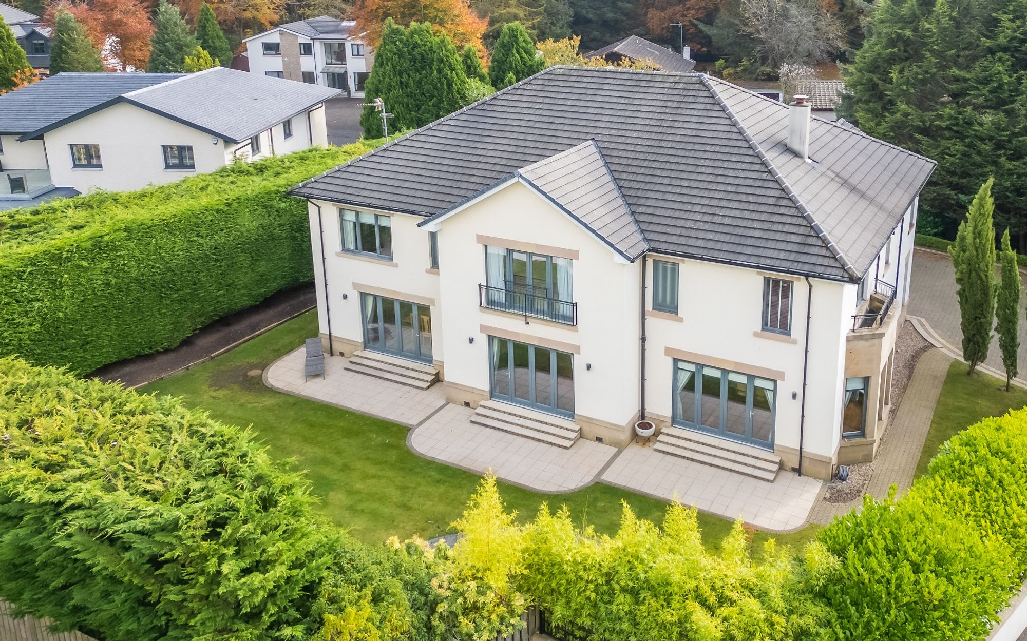The house is entered through electric wrought iron gates with a high boundary wall and conifers screening the entire grounds. A monoblock driveway gives access to the extensive three car garage, providing ample secure parking and gives access to the entrance vestibule.