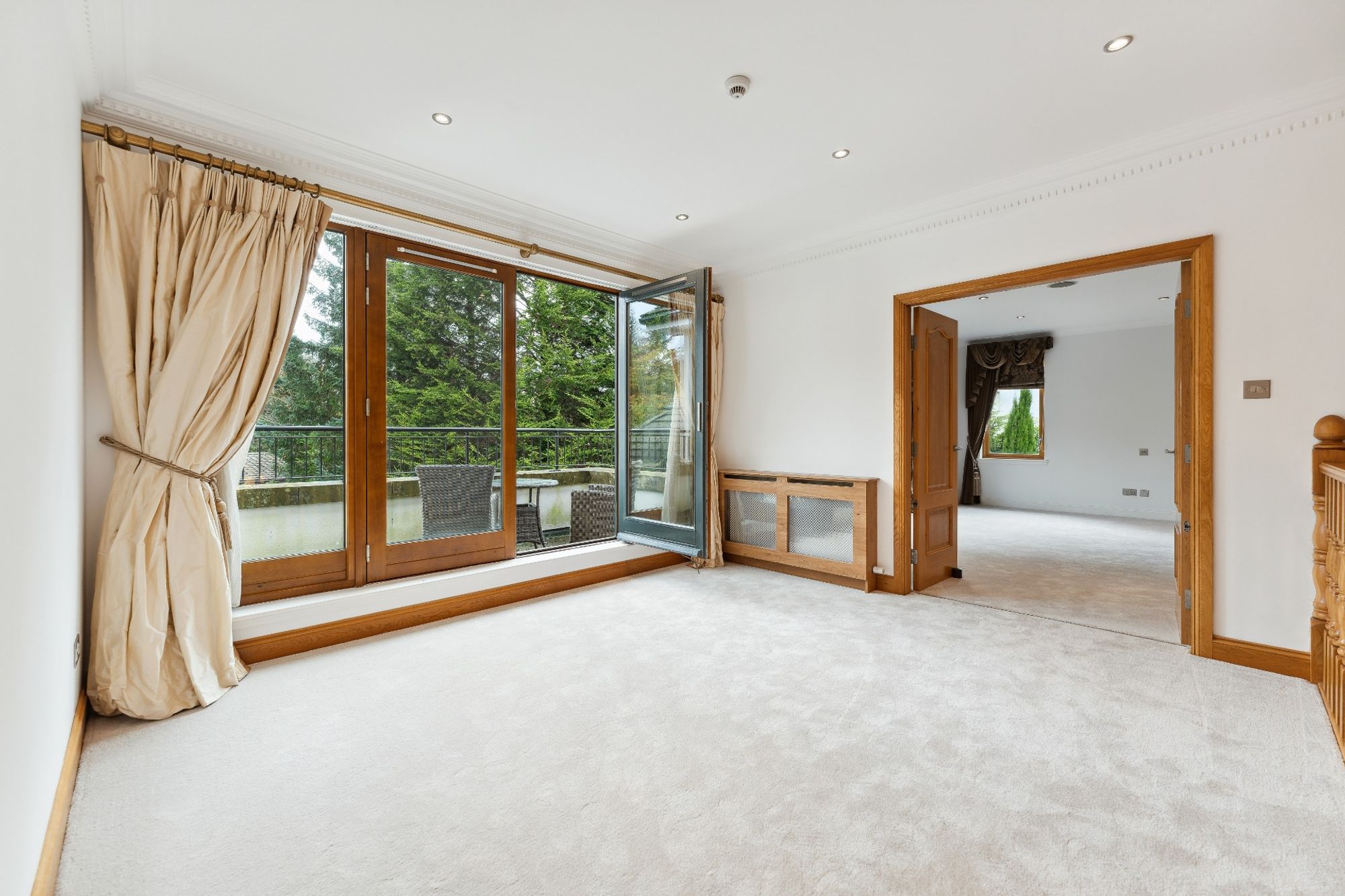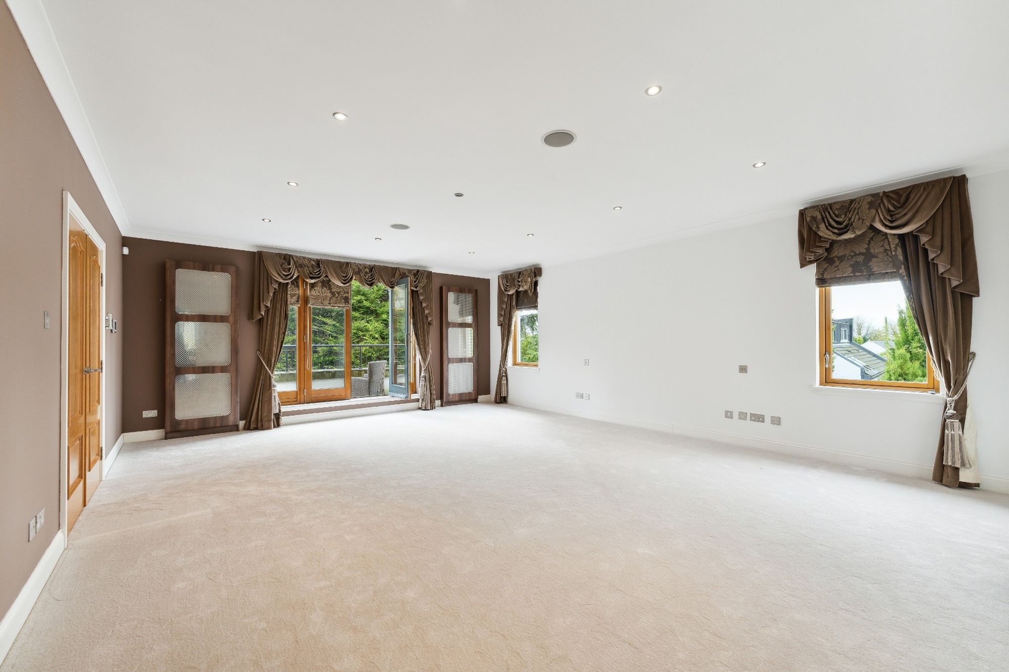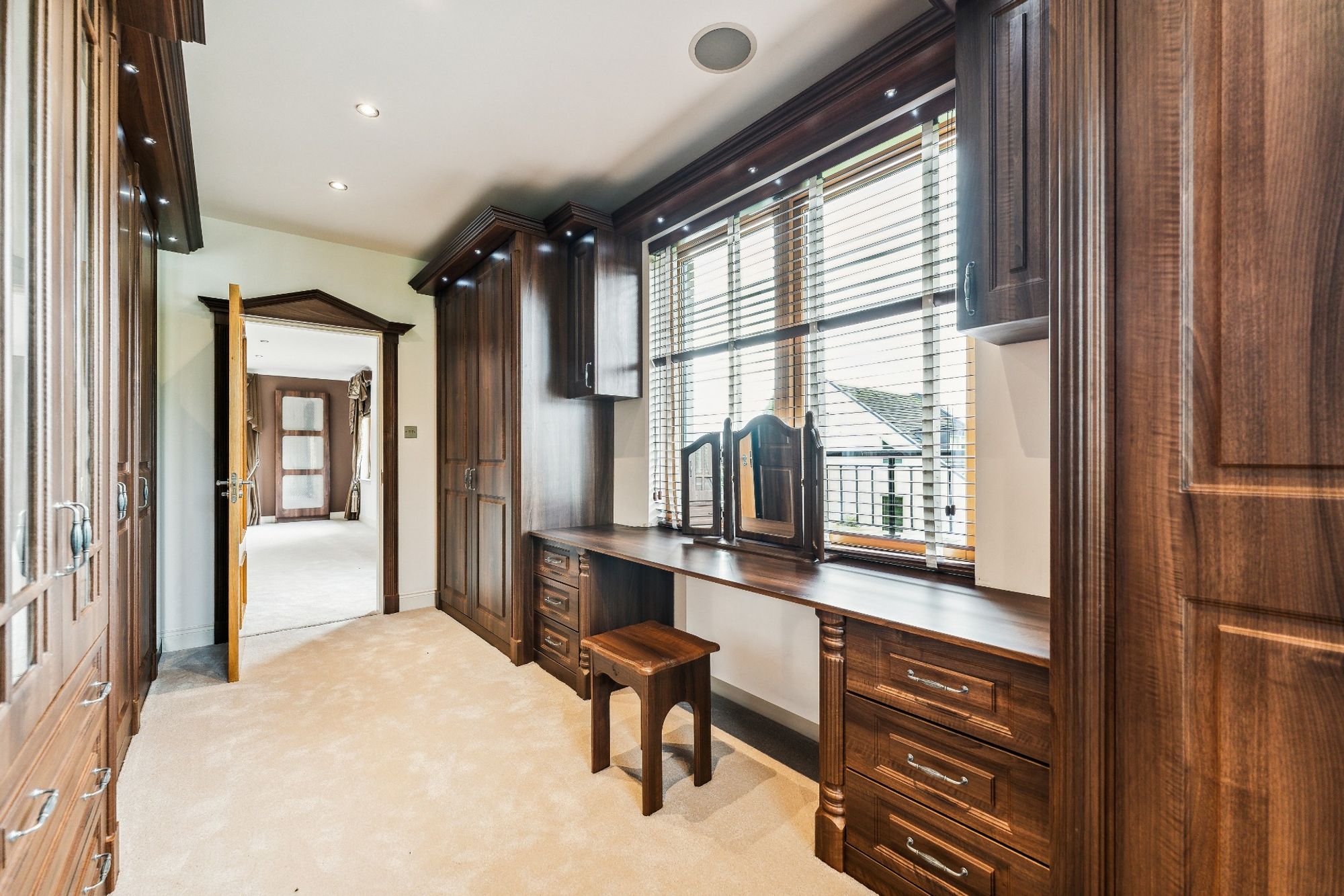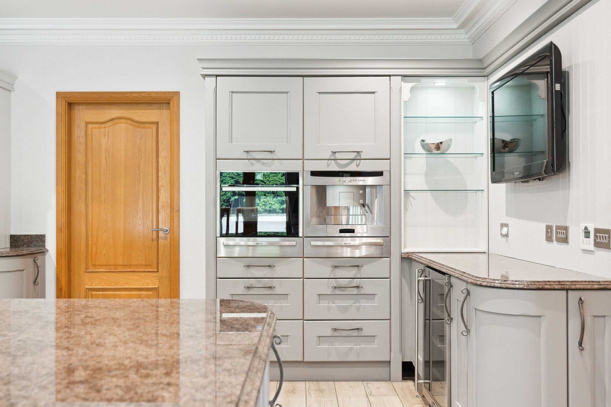 The house is entered through electric wrought iron gates with a high boundary wall and conifers screening the entire grounds. A monoblock driveway gives access to the extensive three car garage, providing ample secure parking and gives access to the entrance vestibule.