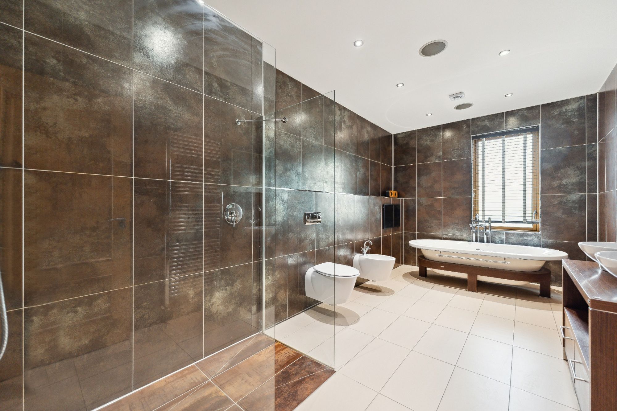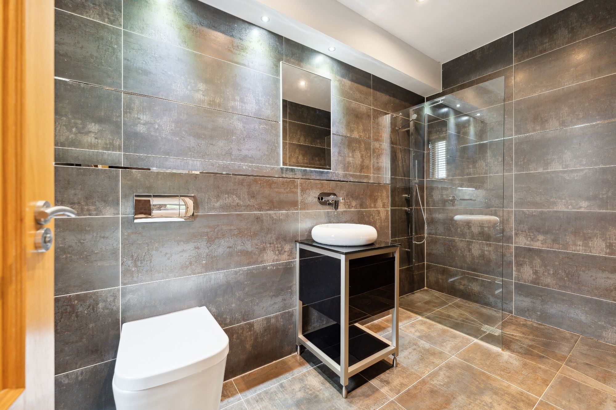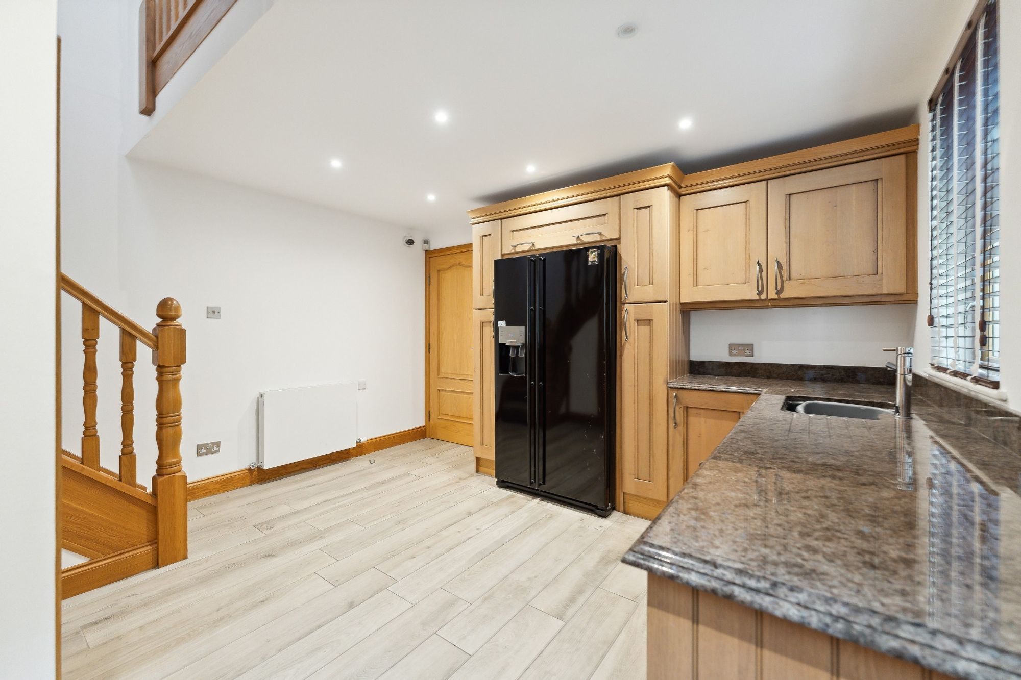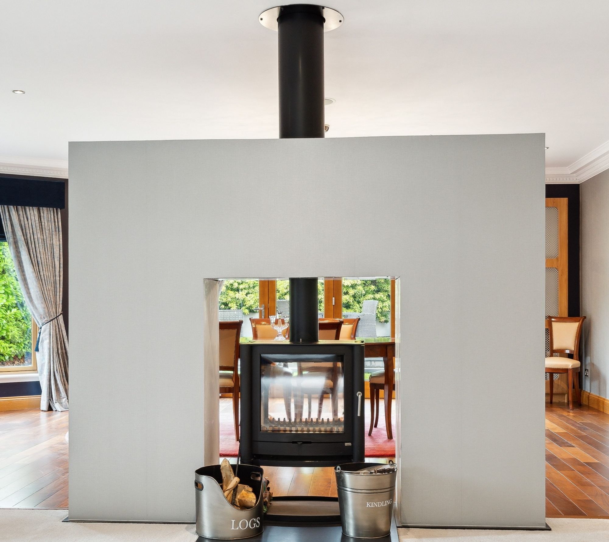 The house is entered through electric wrought iron gates with a high boundary wall and conifers screening the entire grounds. A monoblock driveway gives access to the extensive three car garage, providing ample secure parking and gives access to the entrance vestibule.