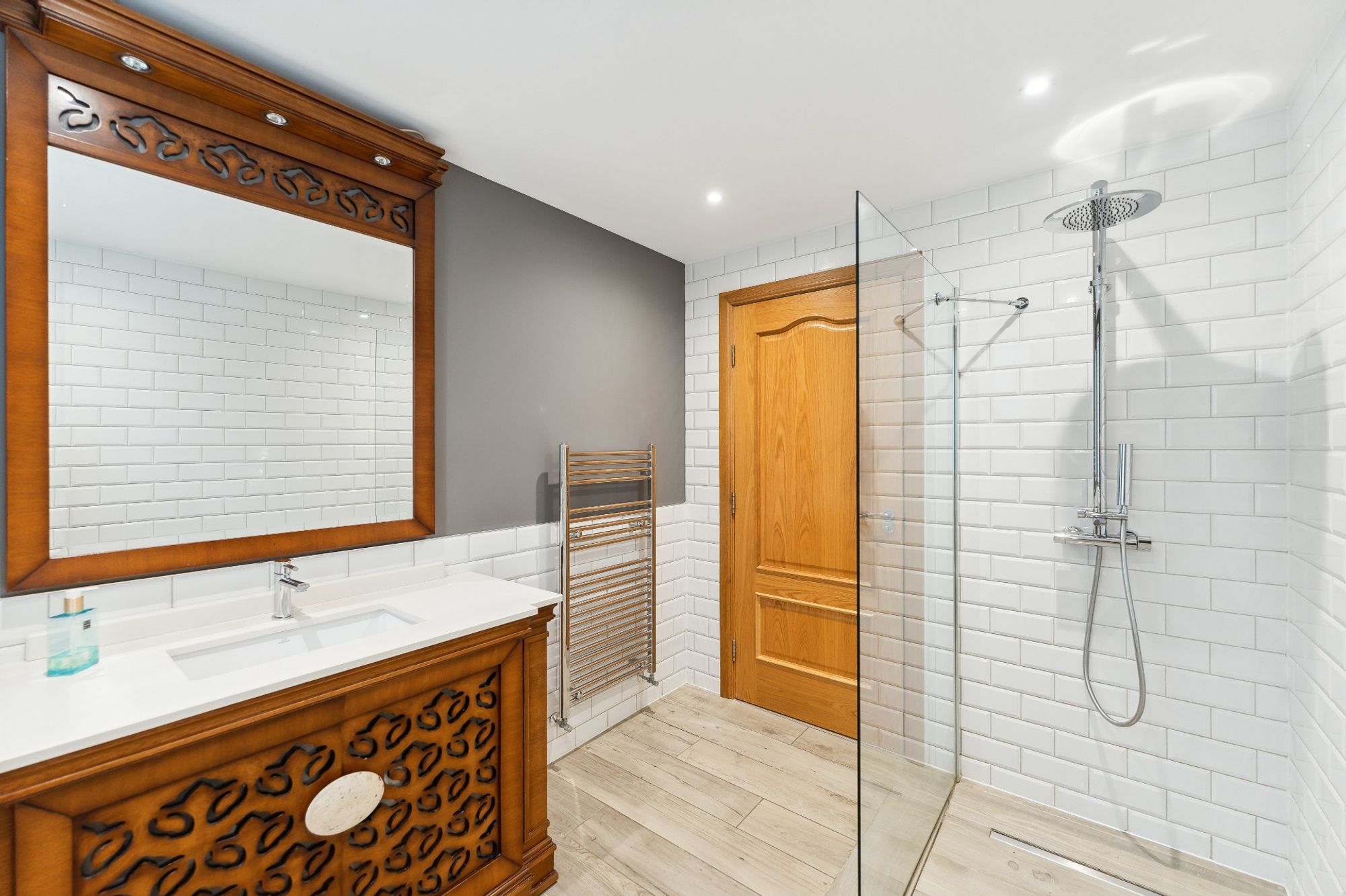 In addition a staircase from the laundry room gives access to the large self contained area above the garage providing a very large bedroom, dressing room and en-suite bathroom.