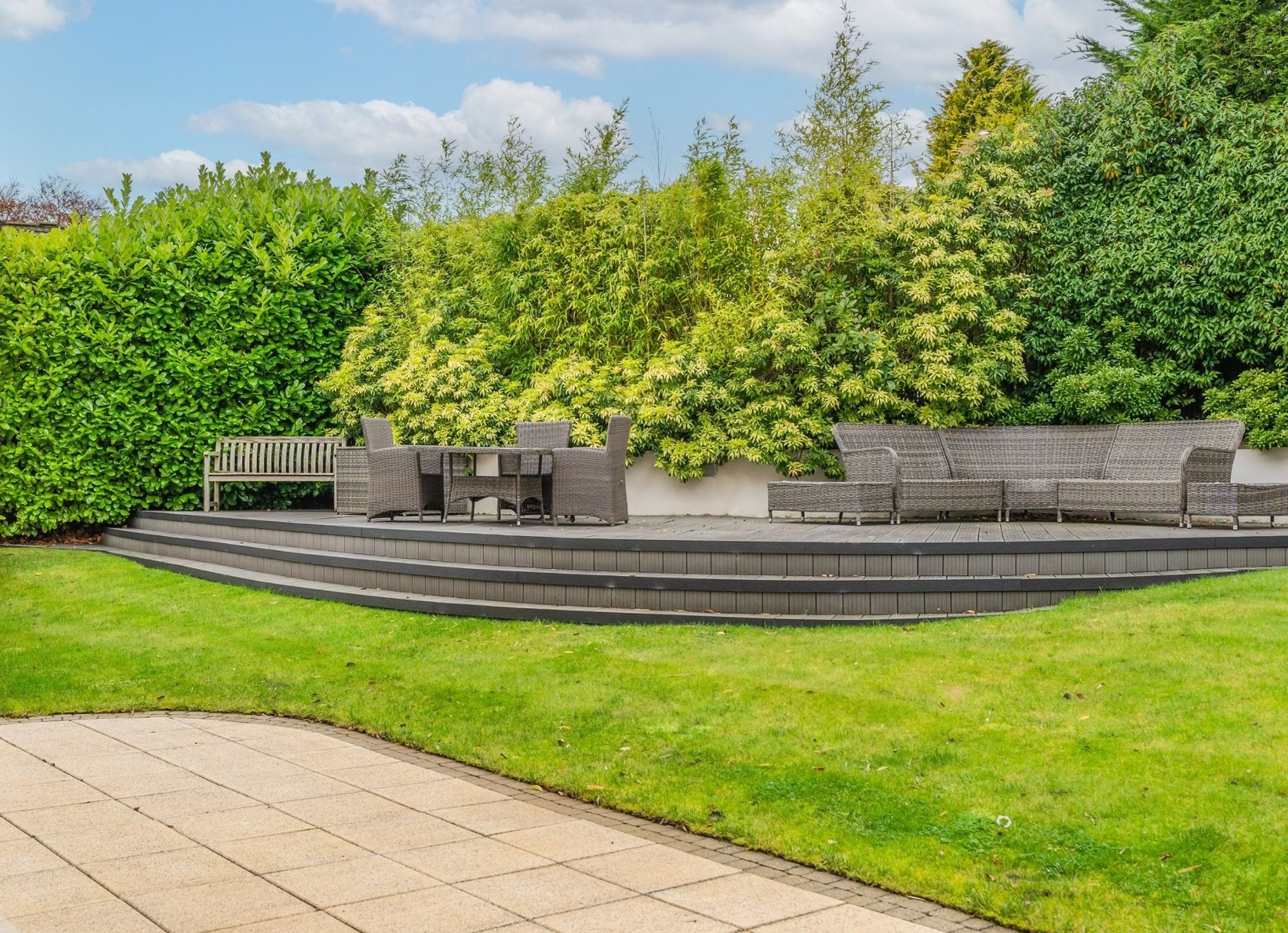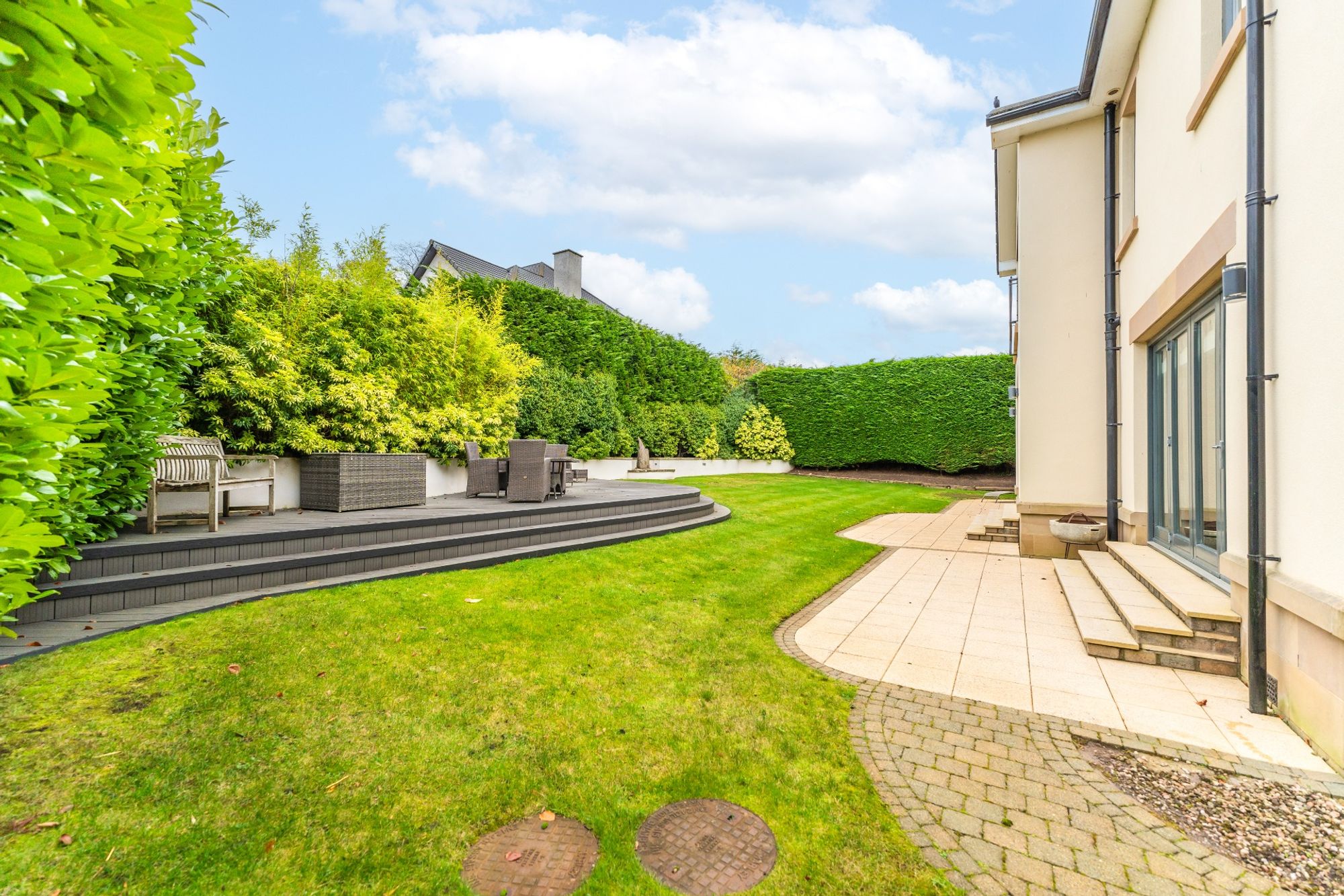 The sheltered side and rear gardens are mainly laid to lawn with a decked seating area in one corner and paved areas adjoining the sitting room, family room and kitchen.