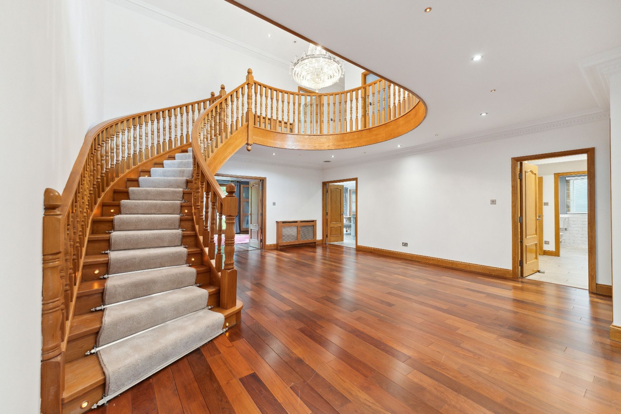 On the first floor there is a superb galleried upper hall, with home office and french doors to the terrace, master bedroom suite with french doors to terrace, fully fitted dressing room and exceptional en-suite bathroom. There are three further large double bedrooms, all with en-suite bathrooms, and a further staircase gives access to the second floor which provides an extremely large and versatile space which could be used as an additional bedroom, playroom or home cinema. This area also has a useful w/c compartment.
