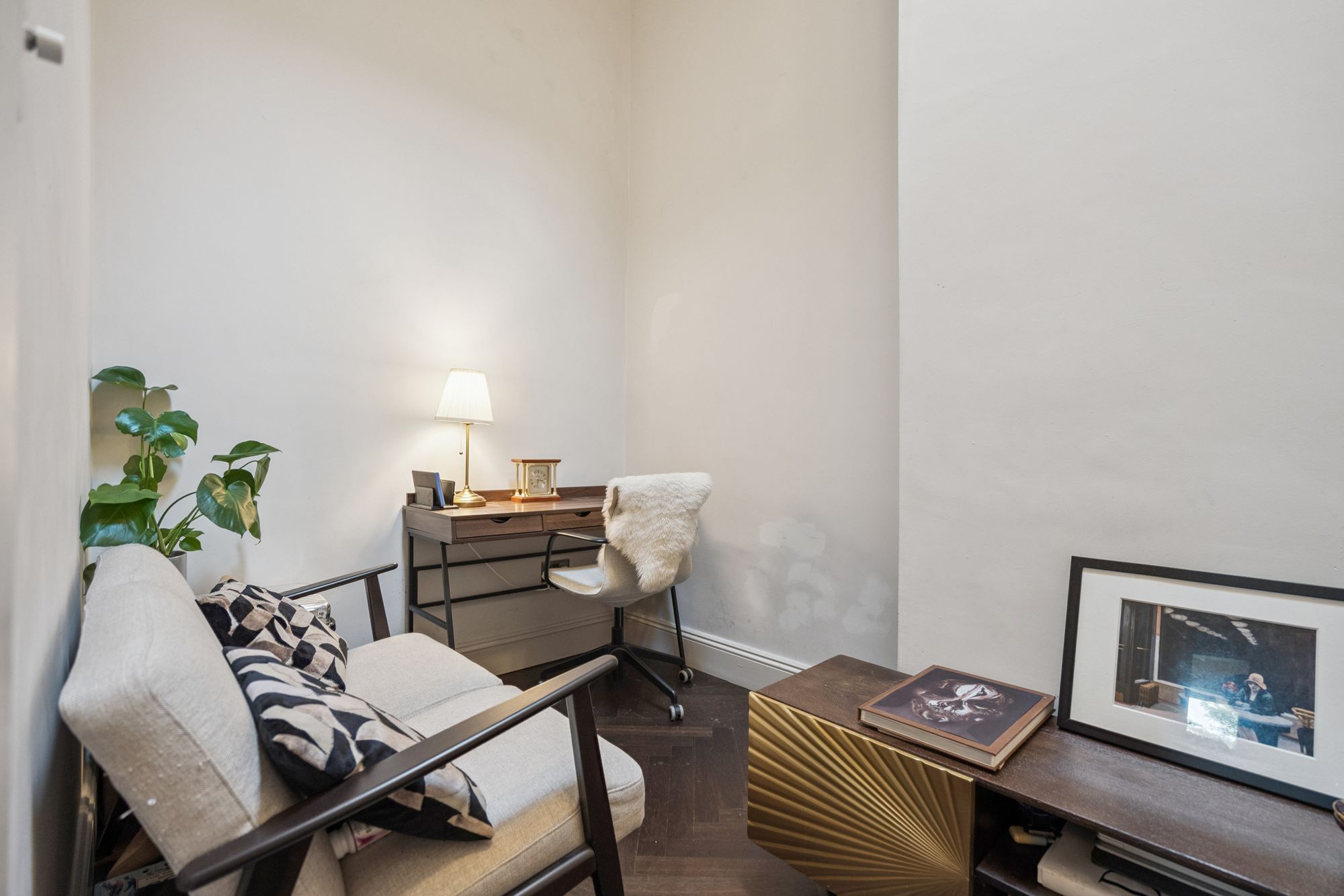Set within a charming Victorian tenement with secure entry, the property welcomes you into a grand reception room where soaring ceilings, large sash windows, intricate cornicing, and elegant dark herringbone parquet flooring create a sense of space and sophistication. A feature fireplace and designer radiator add warmth and character, making this a truly inviting living area.