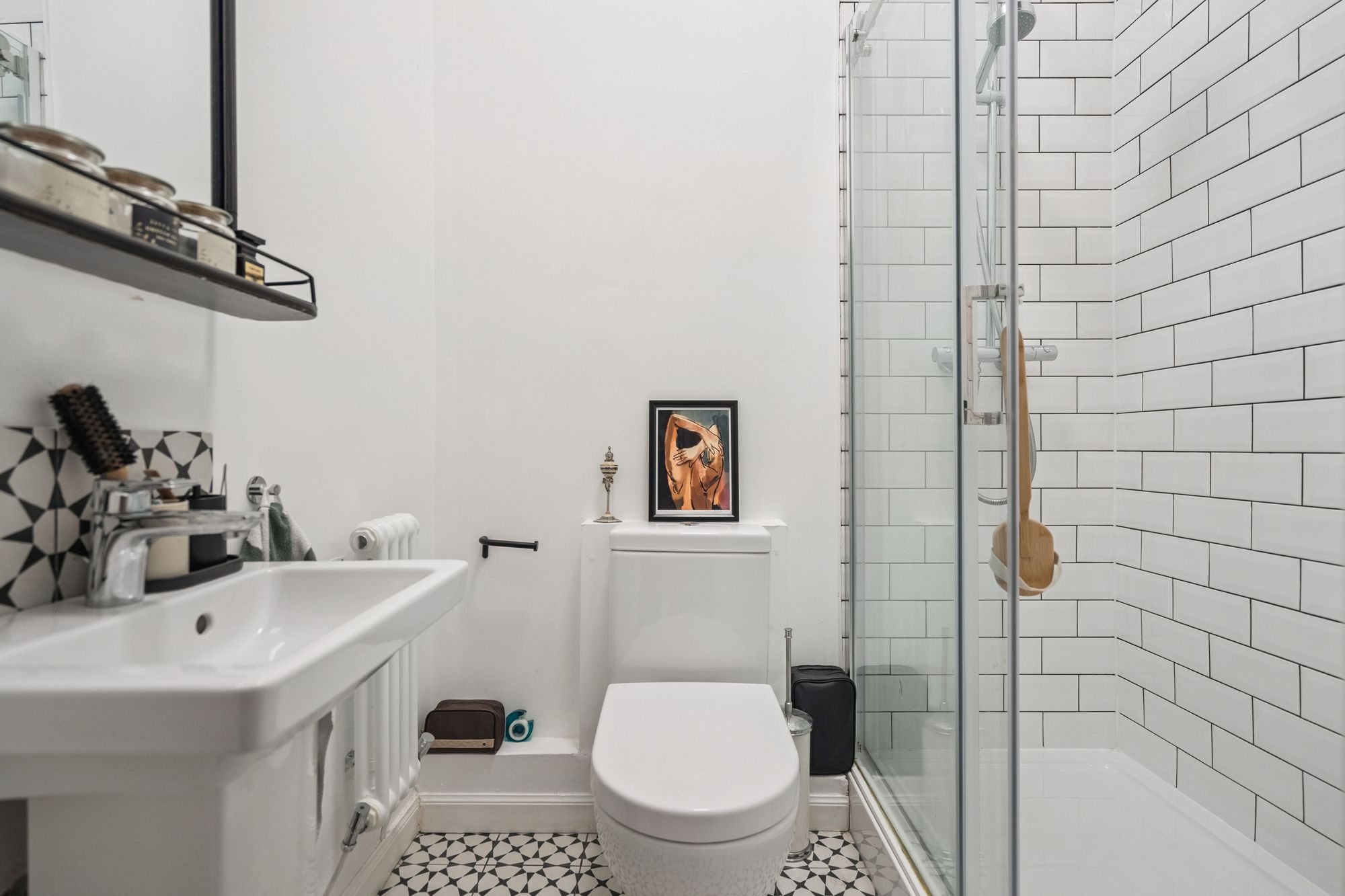 There are two generous double bedrooms, both beautifully finished with high ceilings, detailed cornice work, and matching herringbone flooring. The first bedroom includes built-in storage and a freestanding bath, offering a touch of luxury. The second bedroom benefits from fitted wardrobes and a sleek en-suite shower room, making it ideal as either a principal bedroom or a versatile guest room/home office. In addition, a useful box room provides an excellent option for a study, snug, or extra storage.
