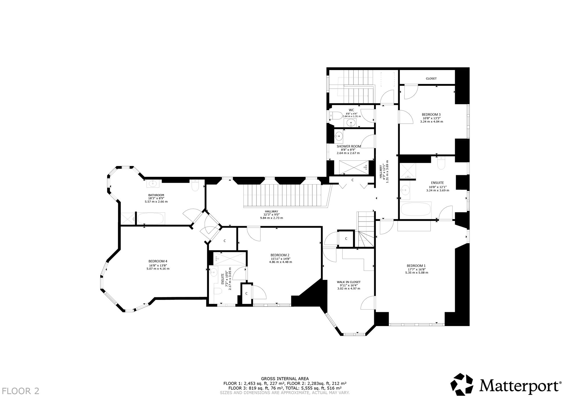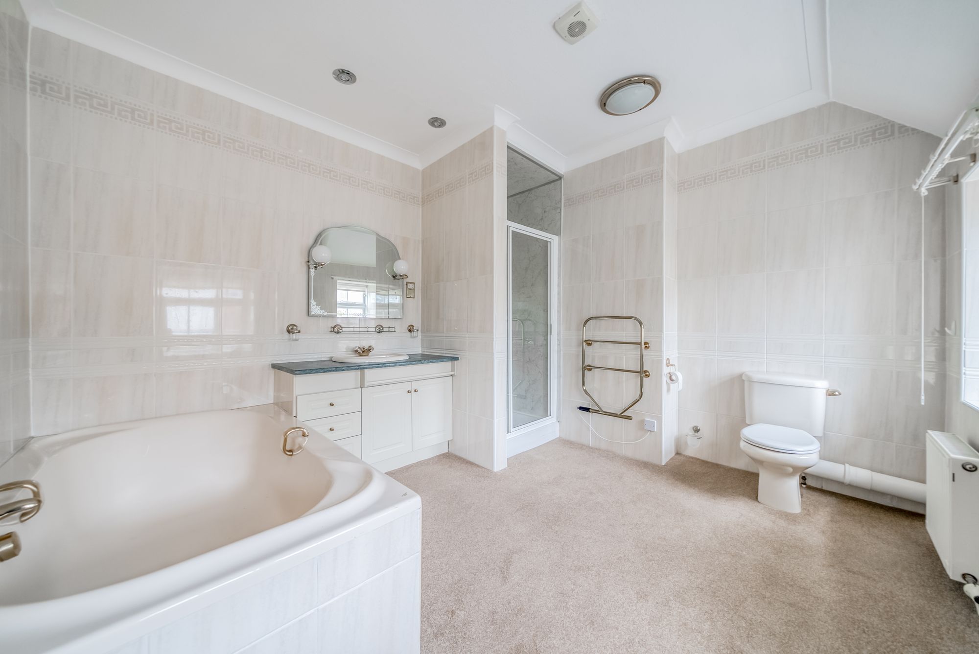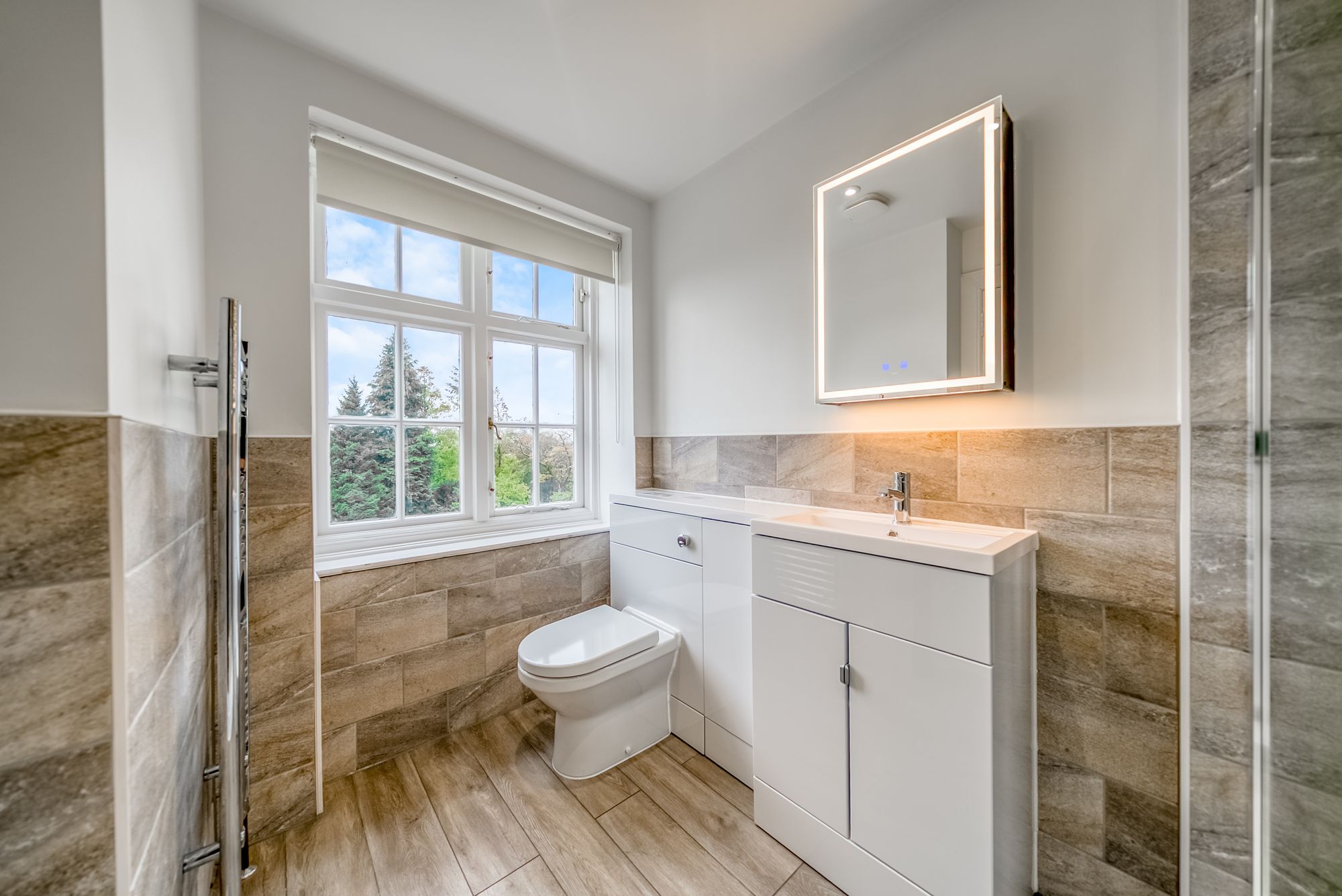 On the first floor, the main landing leads to a luxurious principal bedroom suite, complete with ensuite bathroom and dressing room. Two further bedrooms also benefit from private ensuite facilities, one with a bathroom and one with a shower room, while a fourth bedroom is served by a separate shower room and wash closet. A rear landing offers additional circulation space and access to the upper level.