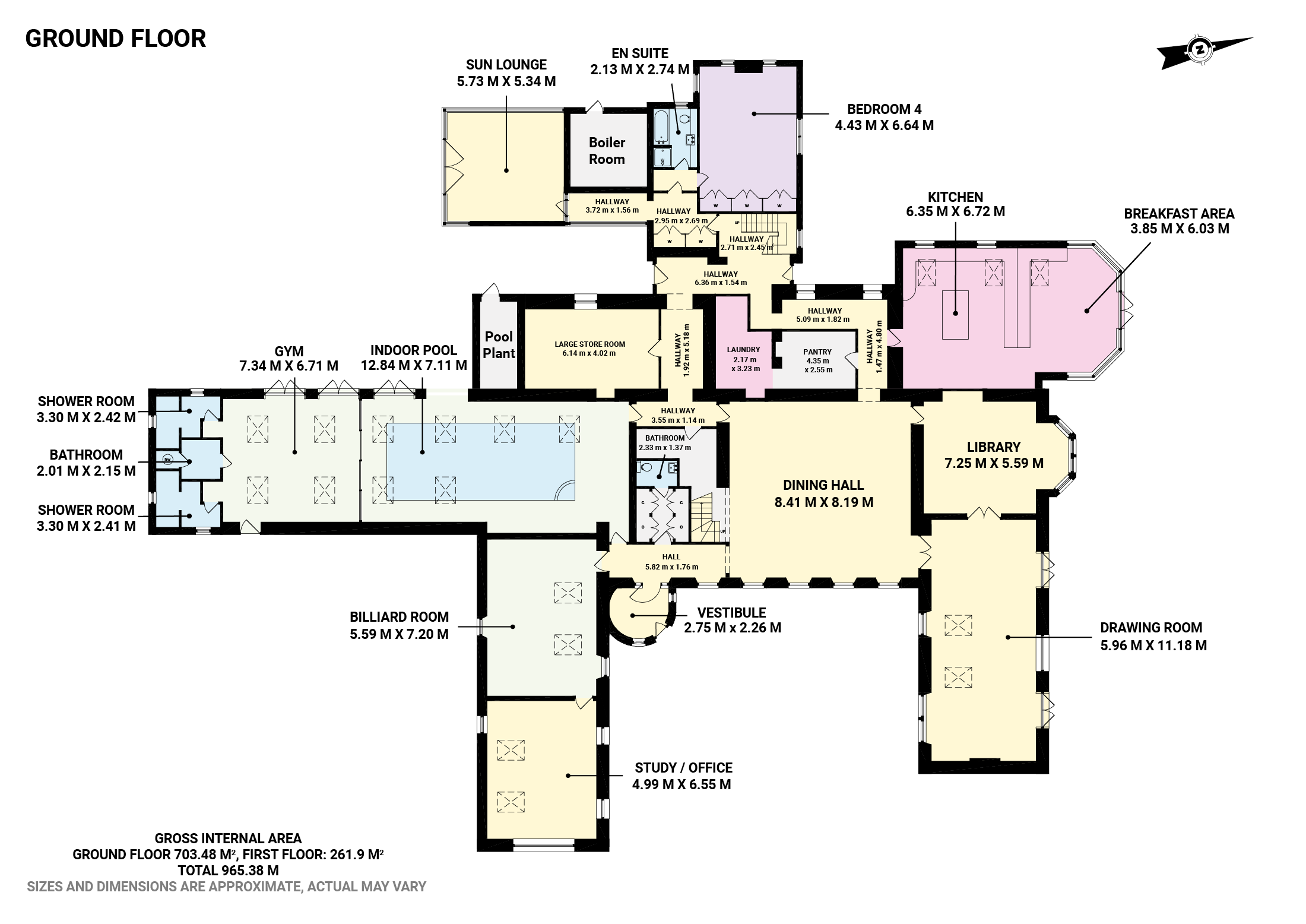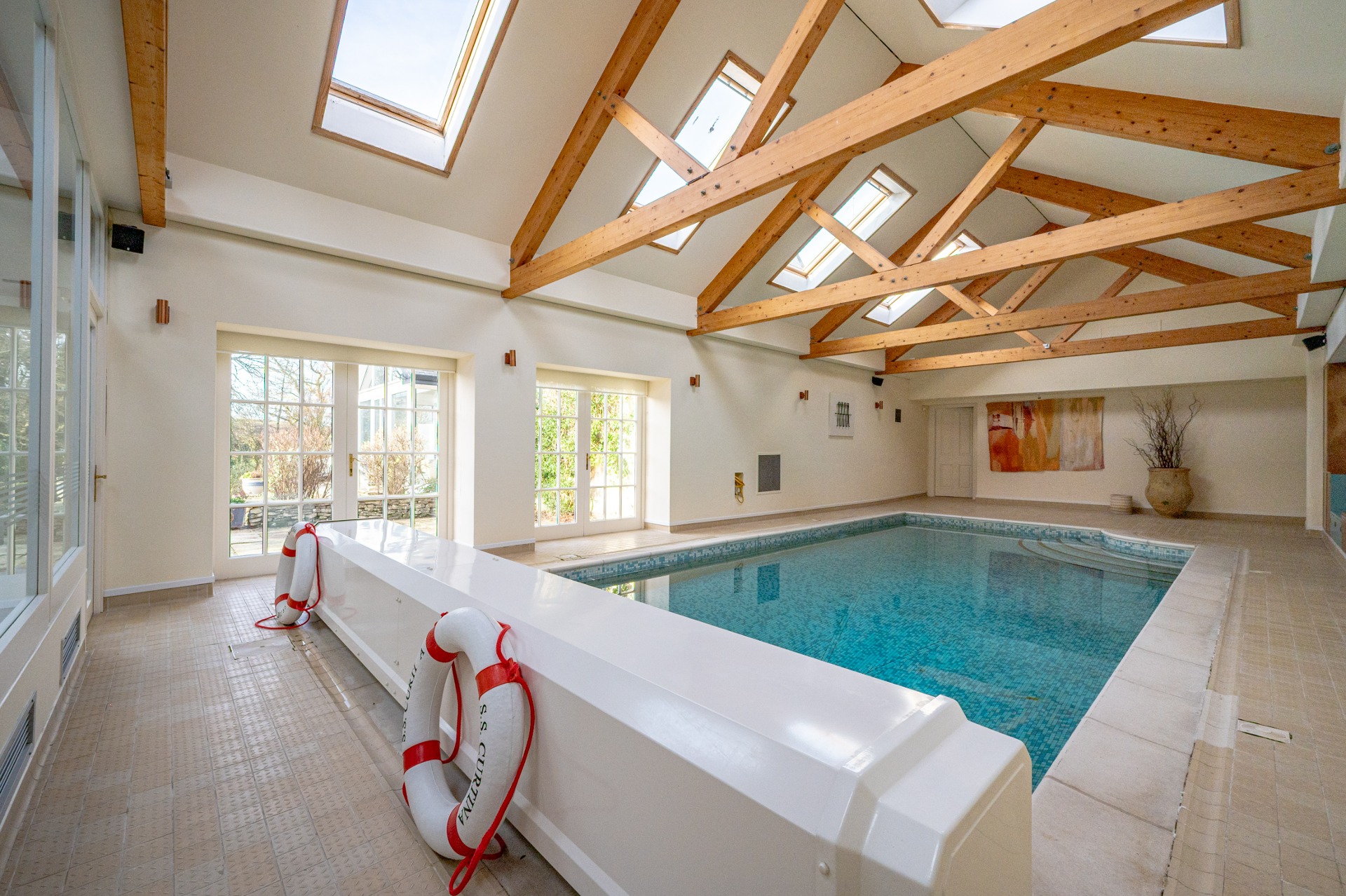 The floor plan and video will give a better idea of form and layout, but a brief summary comprises; entrance vestibule, hallway with cloakroom off, breathtaking dining hall, drawing room with beamed and vaulted ceiling, cosy bay-windowed library, large living kitchen with beamed-vaulted ceiling and large breakfasting living area with full width window and doors to garden, guest bedroom with en-suite bathroom, sun room with access to garden, laundry room and a number of large store rooms. From the entrance hall there is access to the billiard/games room, study/playroom and swimming pool complex with vaulted ceiling. This area offers a large pool and gymnasium with two shower rooms and cloakroom.