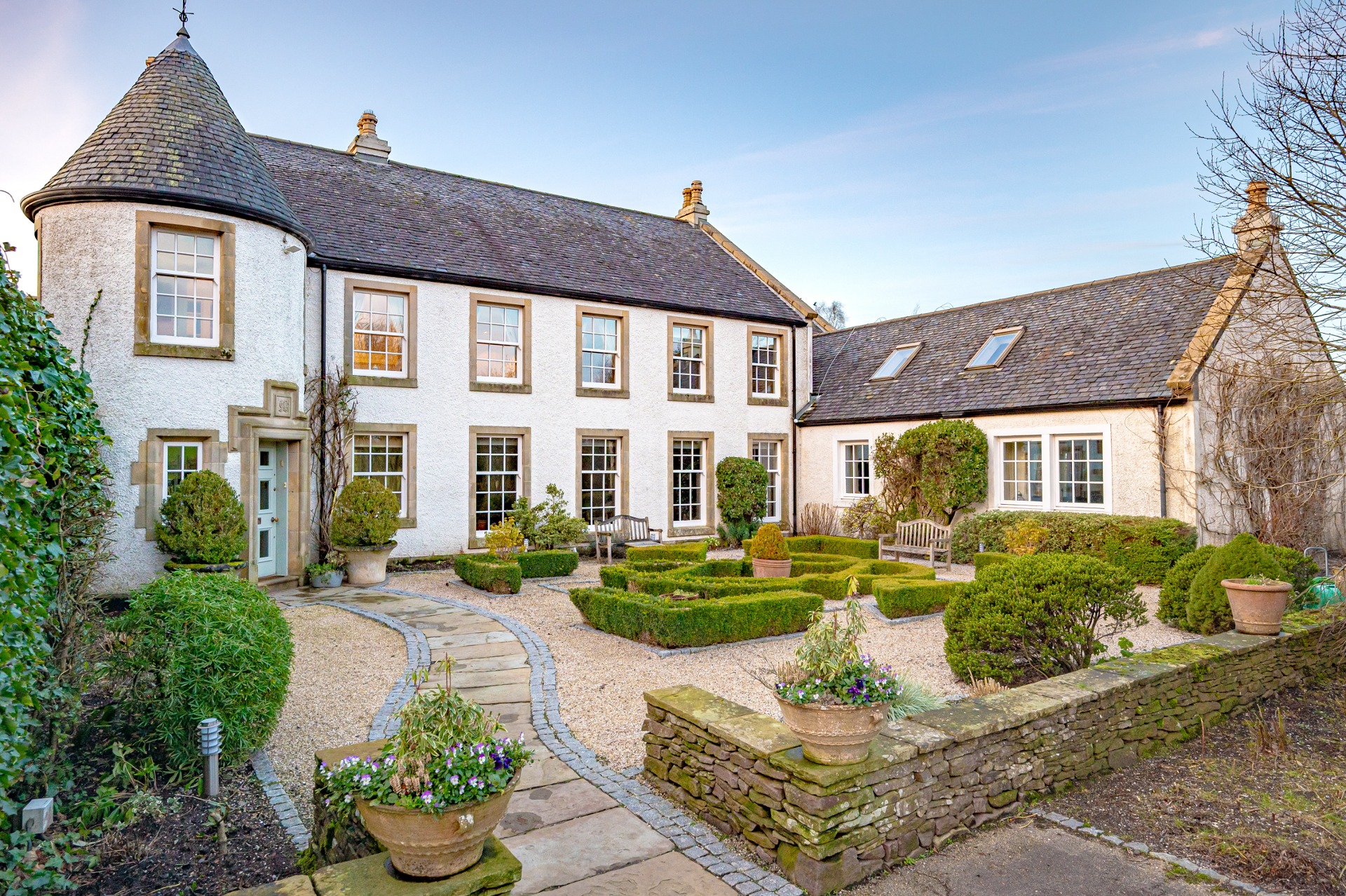 The house has been built in a traditional 18th century country manor style using white painted roughcast, natural stone, grey slate roof and a delightful turreted entrance vestibule.