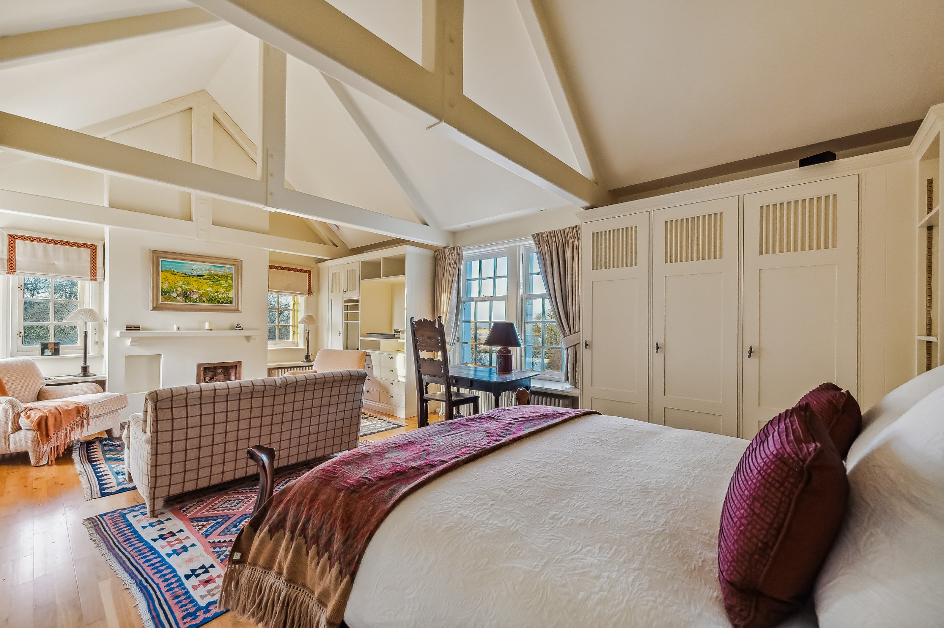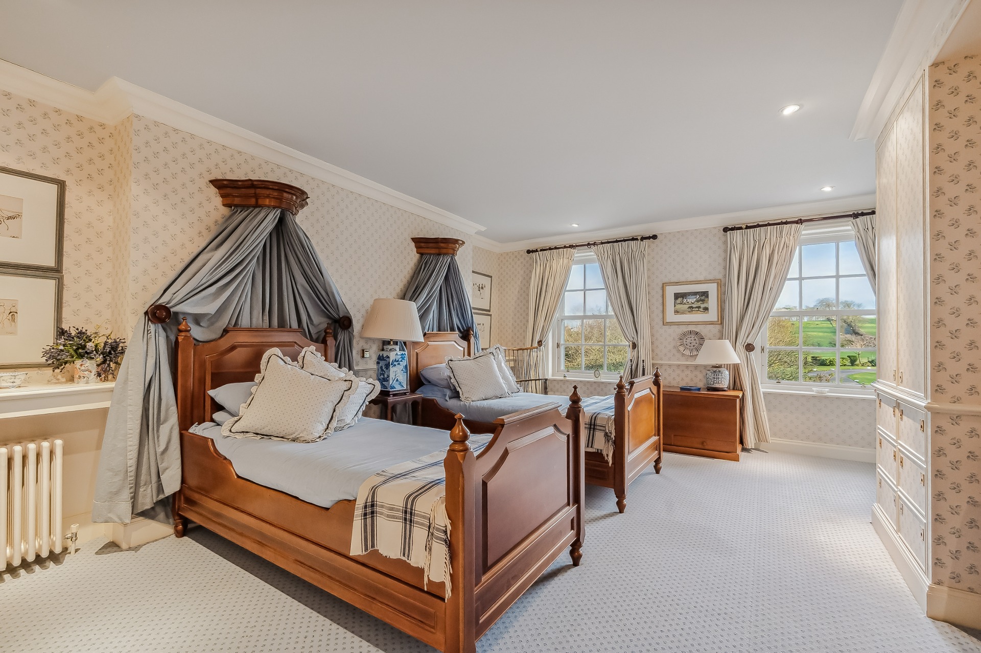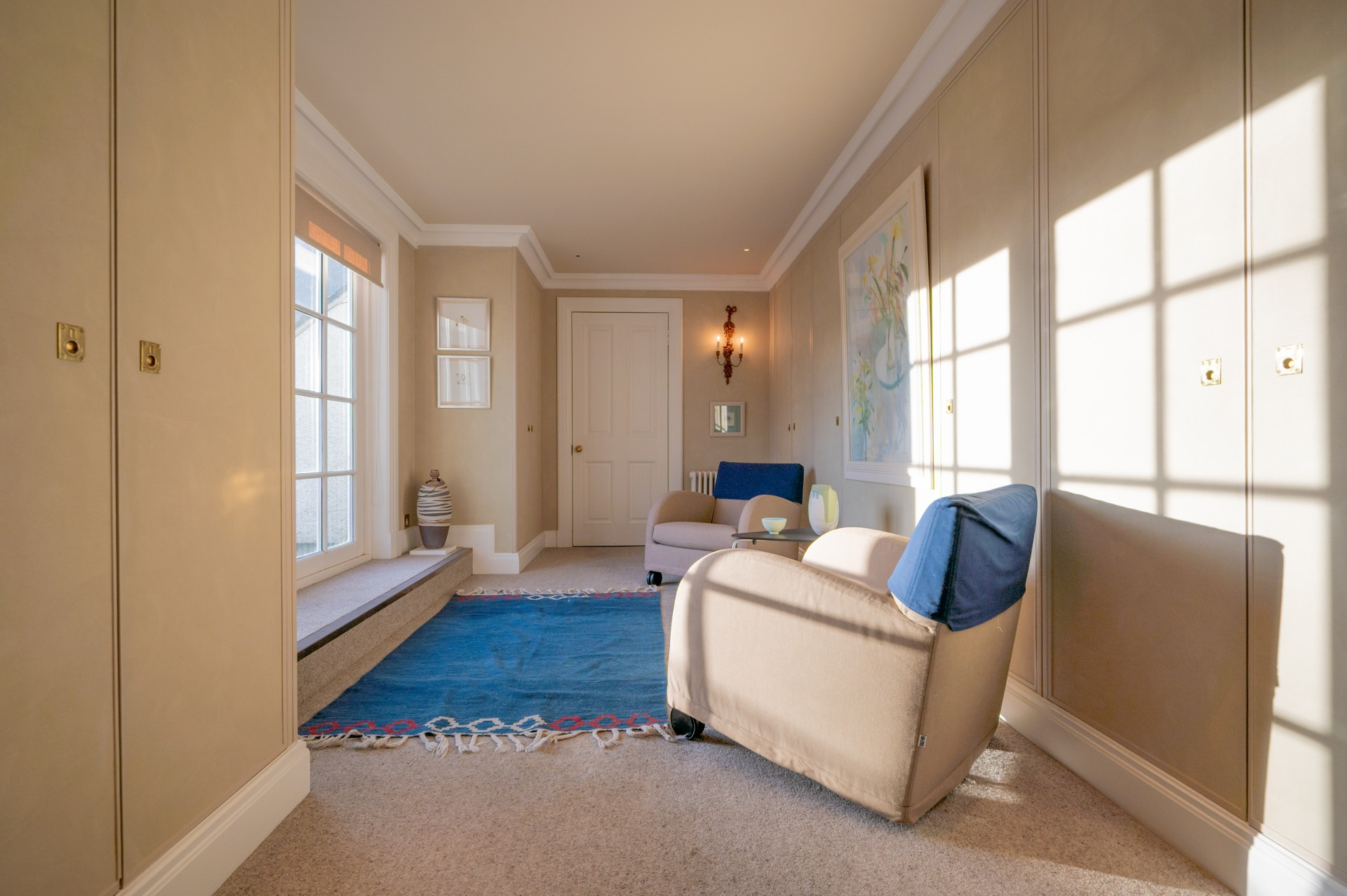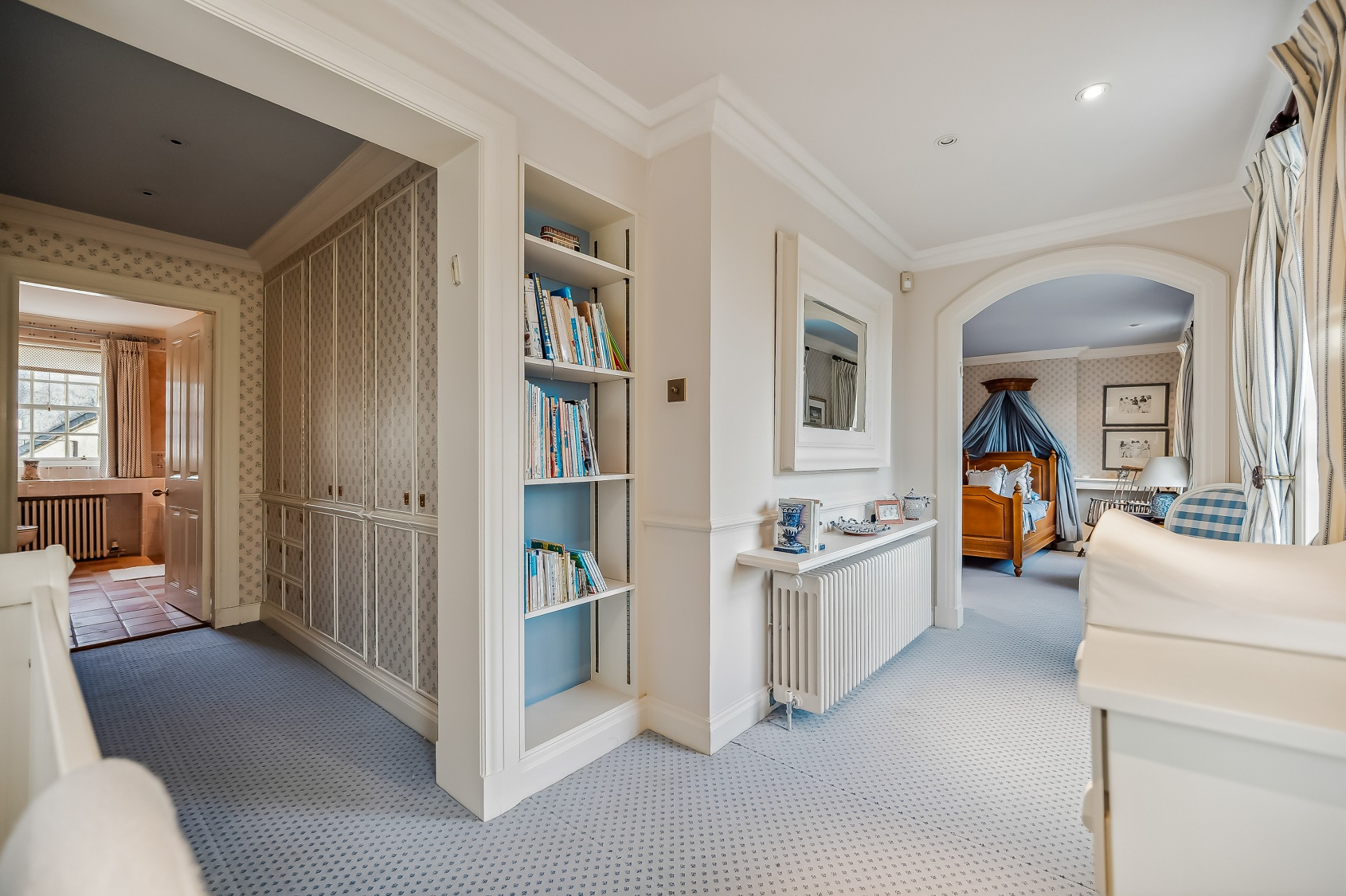 Two wide tread staircases give access to the upper hall and delightful sitting area with French door and small terrace. The master bedroom suite extends to over 1000 sq ft and comprises bay windowed bedroom, large ‘his and hers’ dressing room and fabulous bathroom. Bedroom two again has its own dressing room, en-suite bathroom and delightful reading nook in the turret. There is a third further bedroom suite, again with dressing room and en-suite bathroom.