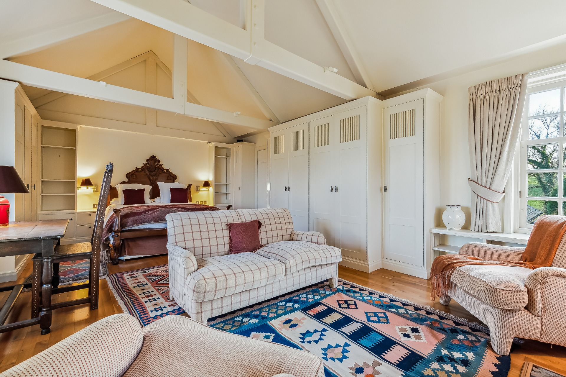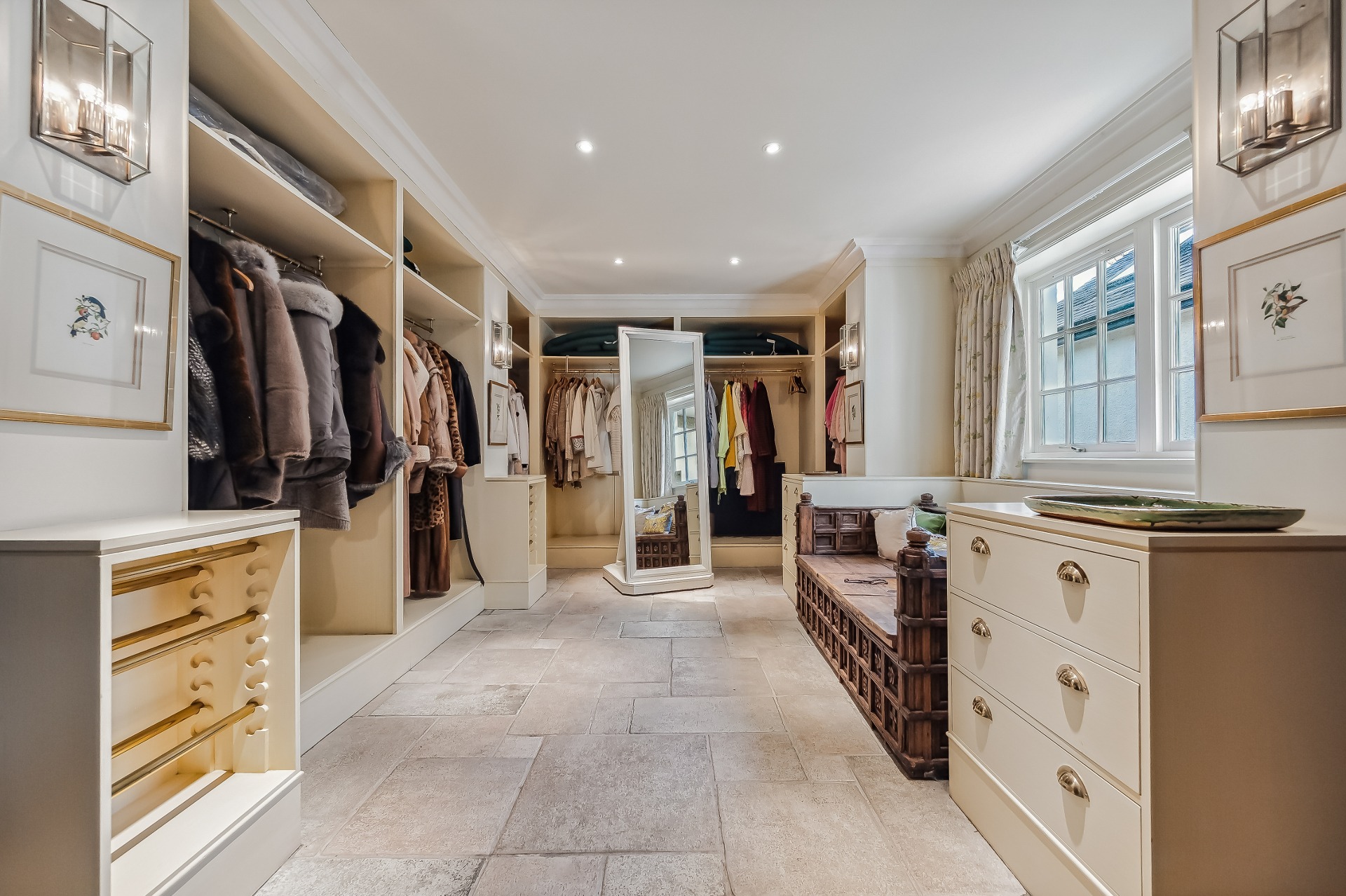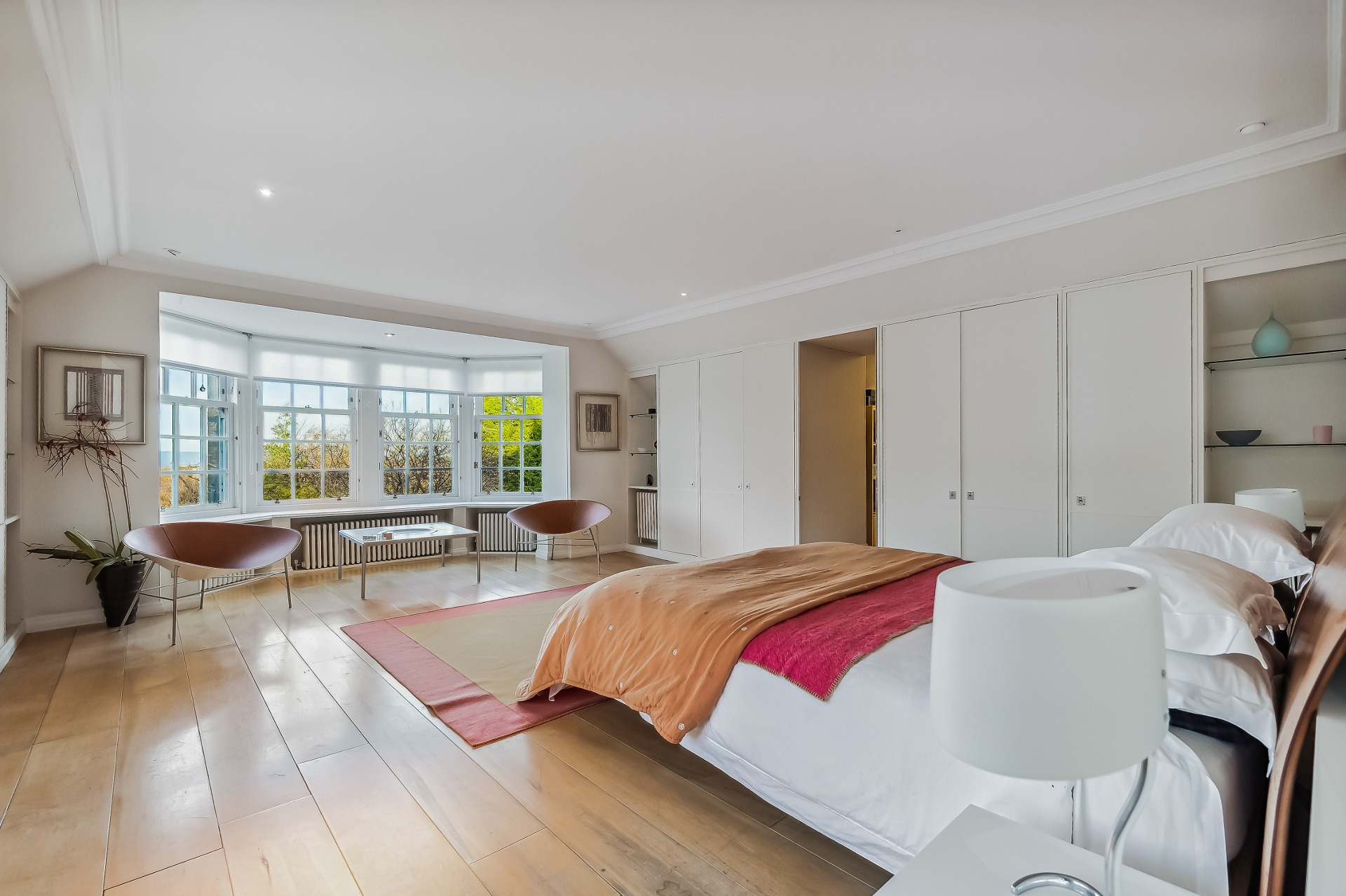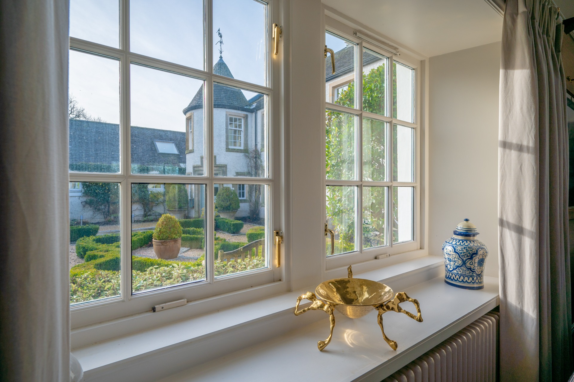 Two wide tread staircases give access to the upper hall and delightful sitting area with French door and small terrace. The master bedroom suite extends to over 1000 sq ft and comprises bay windowed bedroom, large ‘his and hers’ dressing room and fabulous bathroom. Bedroom two again has its own dressing room, en-suite bathroom and delightful reading nook in the turret. There is a third further bedroom suite, again with dressing room and en-suite bathroom.