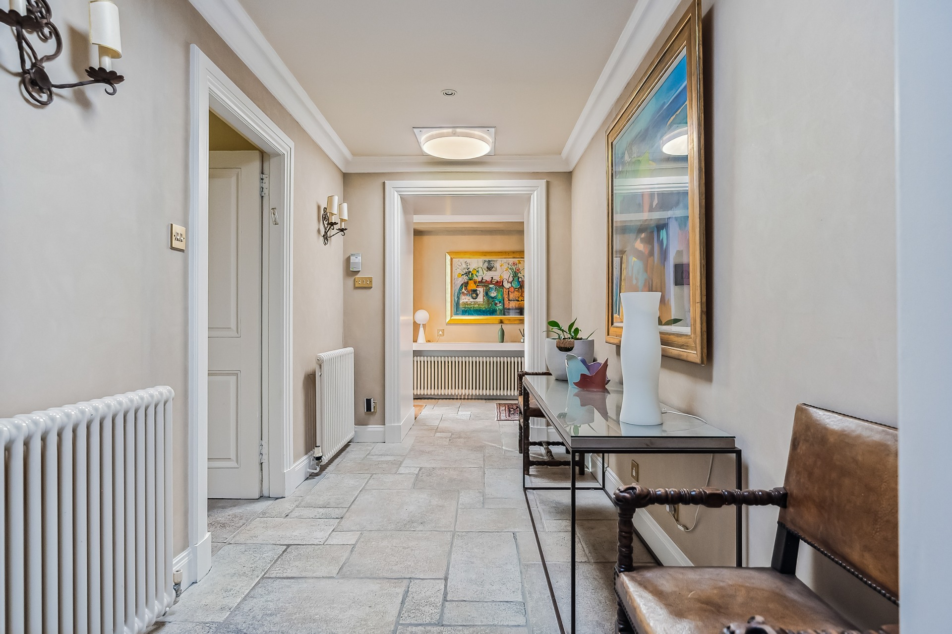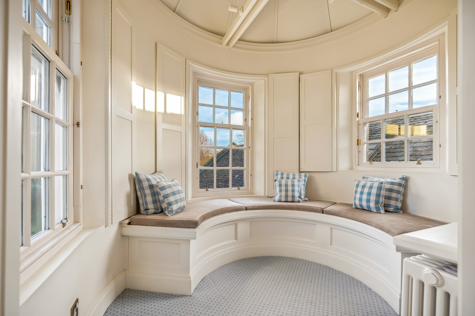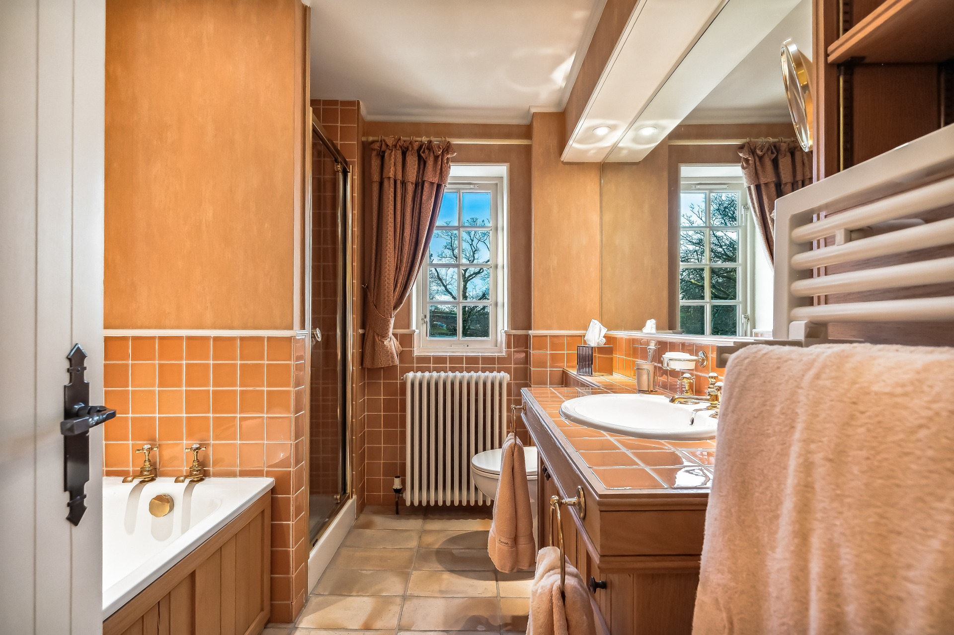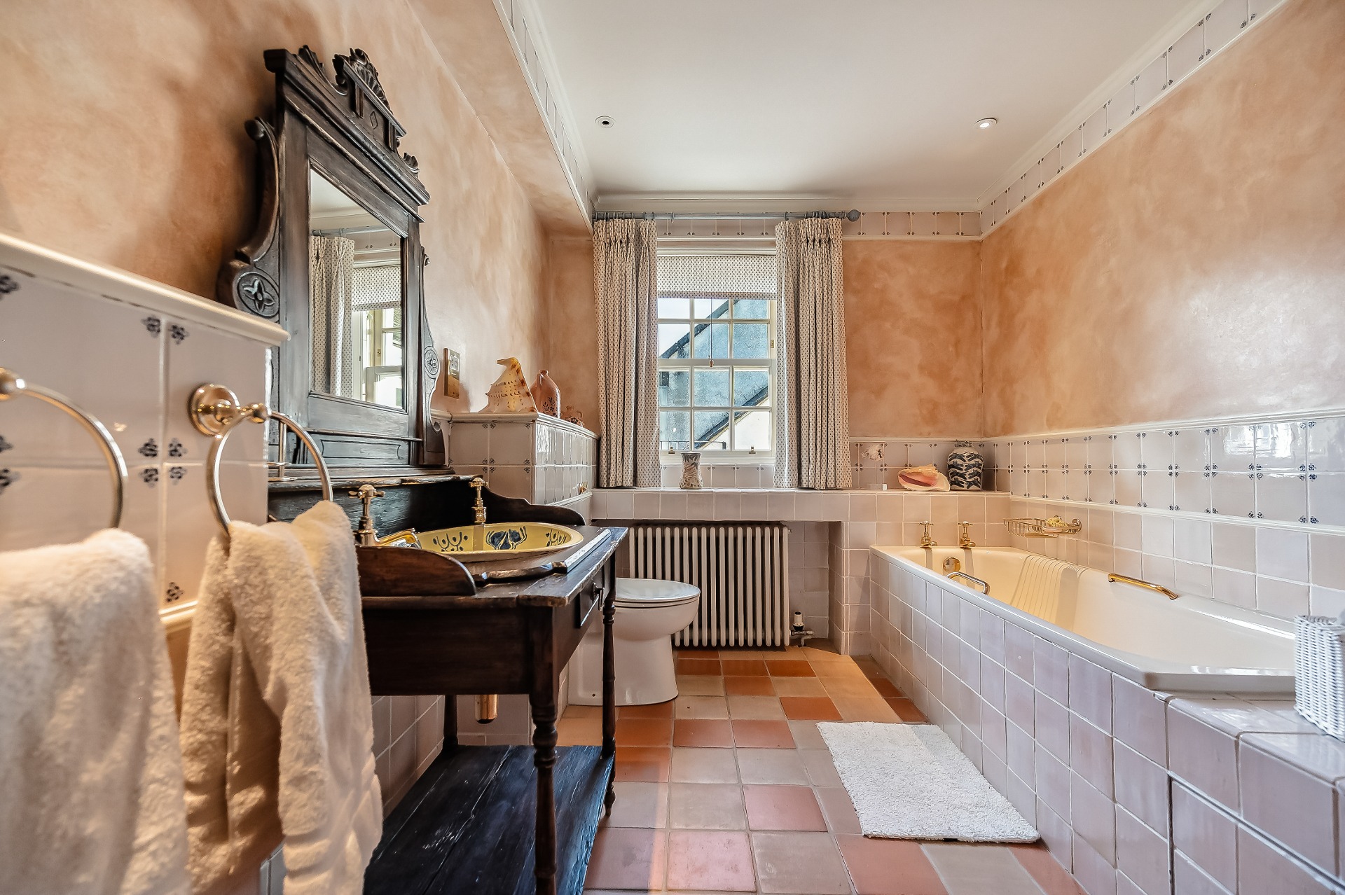 Two wide tread staircases give access to the upper hall and delightful sitting area with French door and small terrace. The master bedroom suite extends to over 1000 sq ft and comprises bay windowed bedroom, large ‘his and hers’ dressing room and fabulous bathroom. Bedroom two again has its own dressing room, en-suite bathroom and delightful reading nook in the turret. There is a third further bedroom suite, again with dressing room and en-suite bathroom.